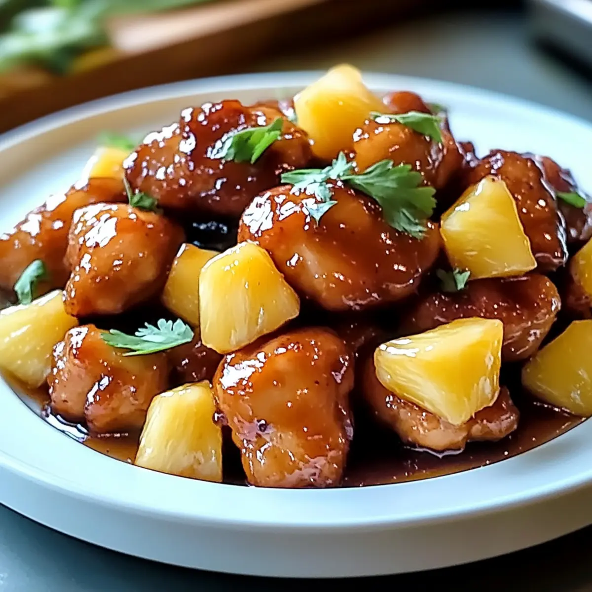 Nehme die Pfanne vom Herd, garnieren das fertige Brauner Zucker Ananas Hühnchen mit frischem Koriander und serviere es direkt mit der zusätzlichen Sauce. Das Gericht sieht nicht nur fantastisch aus, sondern duftet auch verführerisch und bringt einen Hauch tropischer Frische auf den Tisch.