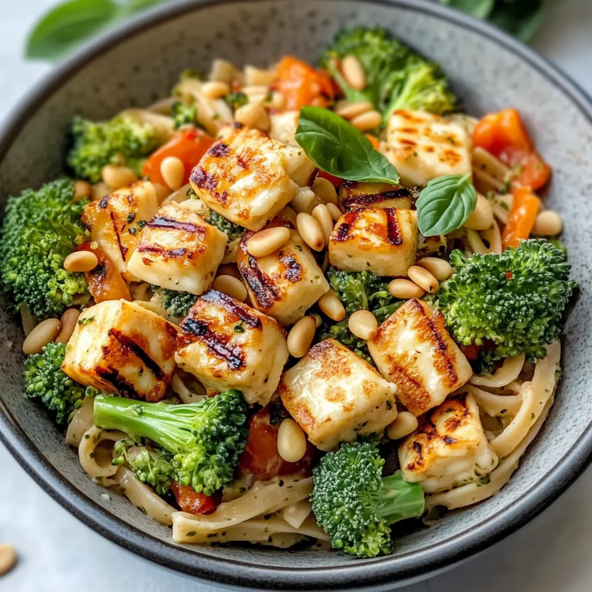 Bevor du den bunten Halloumi-Pasta-Salat servierst, garniere ihn mit den knusprigen Halloumi-Scheiben, gerösteten Pinienkernen und frischen Frühlingszwiebeln. Optional kannst du auch einige frische Basilikumblätter darüber streuen, um einen zusätzlichen Hauch von Frische und Farbe hinzuzufügen. Serviere den Salat sofort und genieße!
