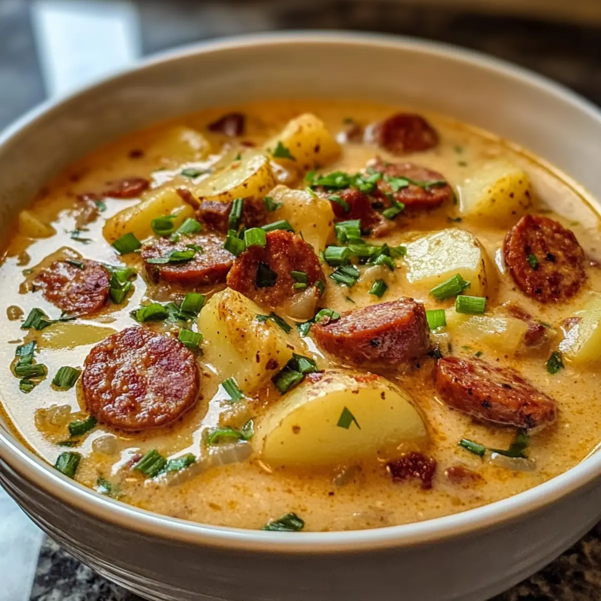 Cremige Cajun Kartoffelsuppe mit Andouille Wurst genießen