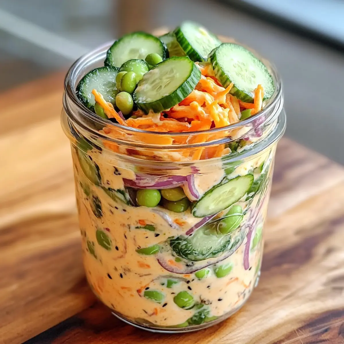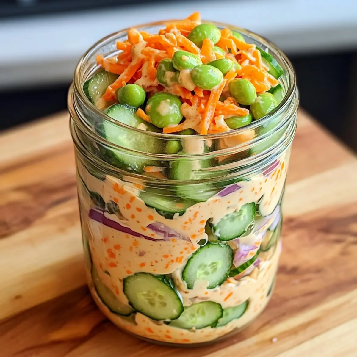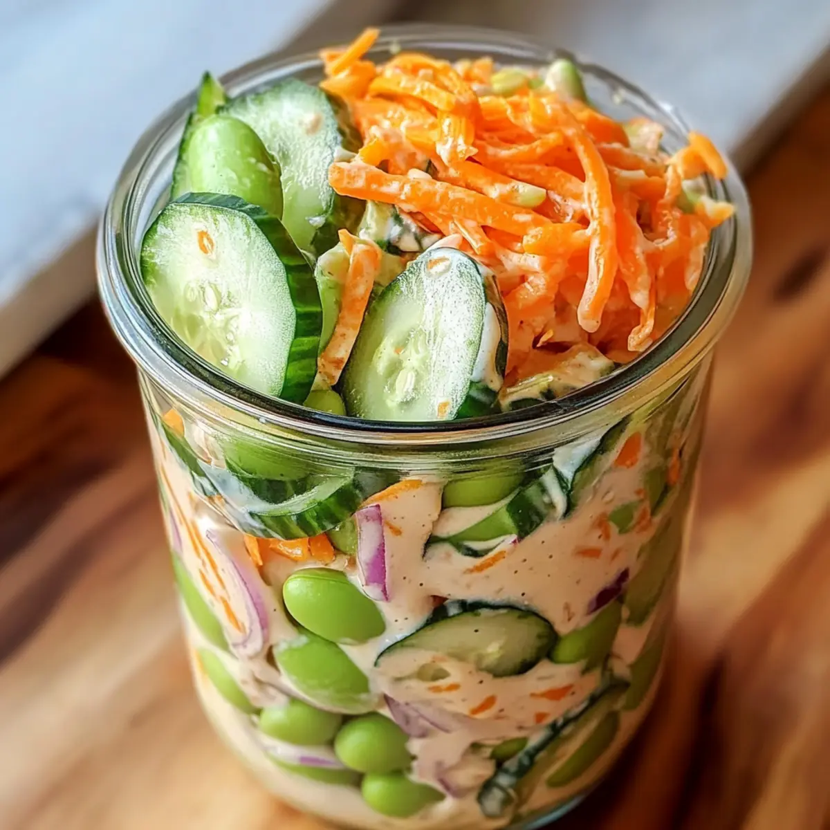 Jetzt die rote Zwiebel, den Tofu, das Edamame, die Karotte und die Frühlingszwiebel der Reihe nach schichten. Beginne mit der roten Zwiebel, gefolgt vom Tofu, und drücke leicht nach unten, um Platz im Glas zu schaffen. Jede Gemüseschicht sorgt nicht nur für eine ansprechende Optik, sondern auch für eine ideale Kombination der Aromen in deiner cremigen asiatischen Gurkensalat-Schüssel.