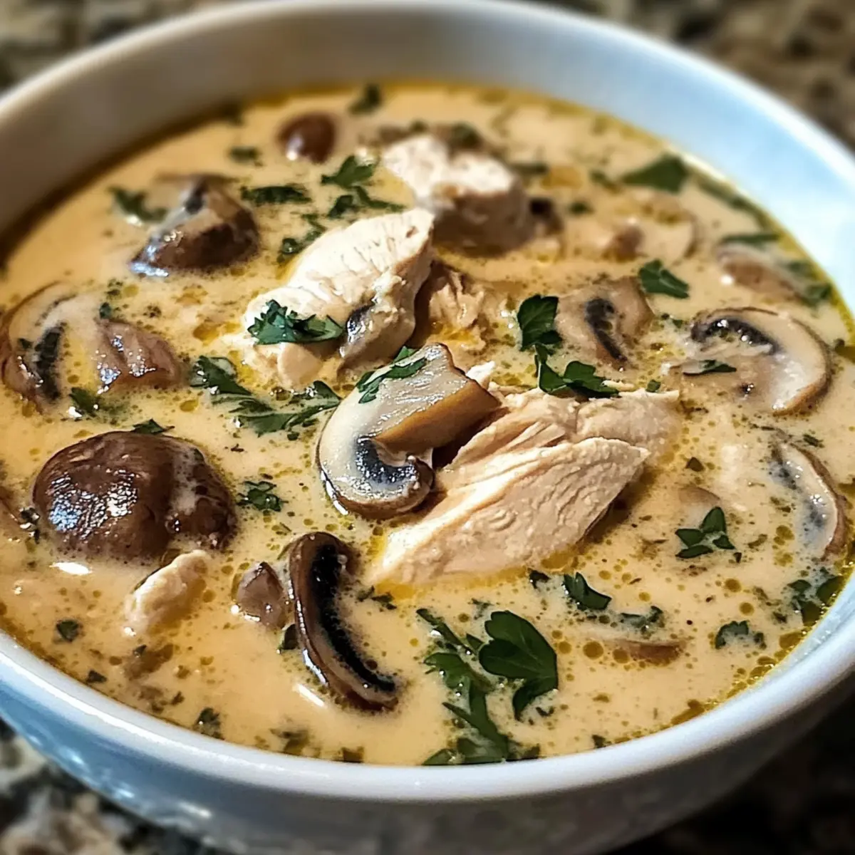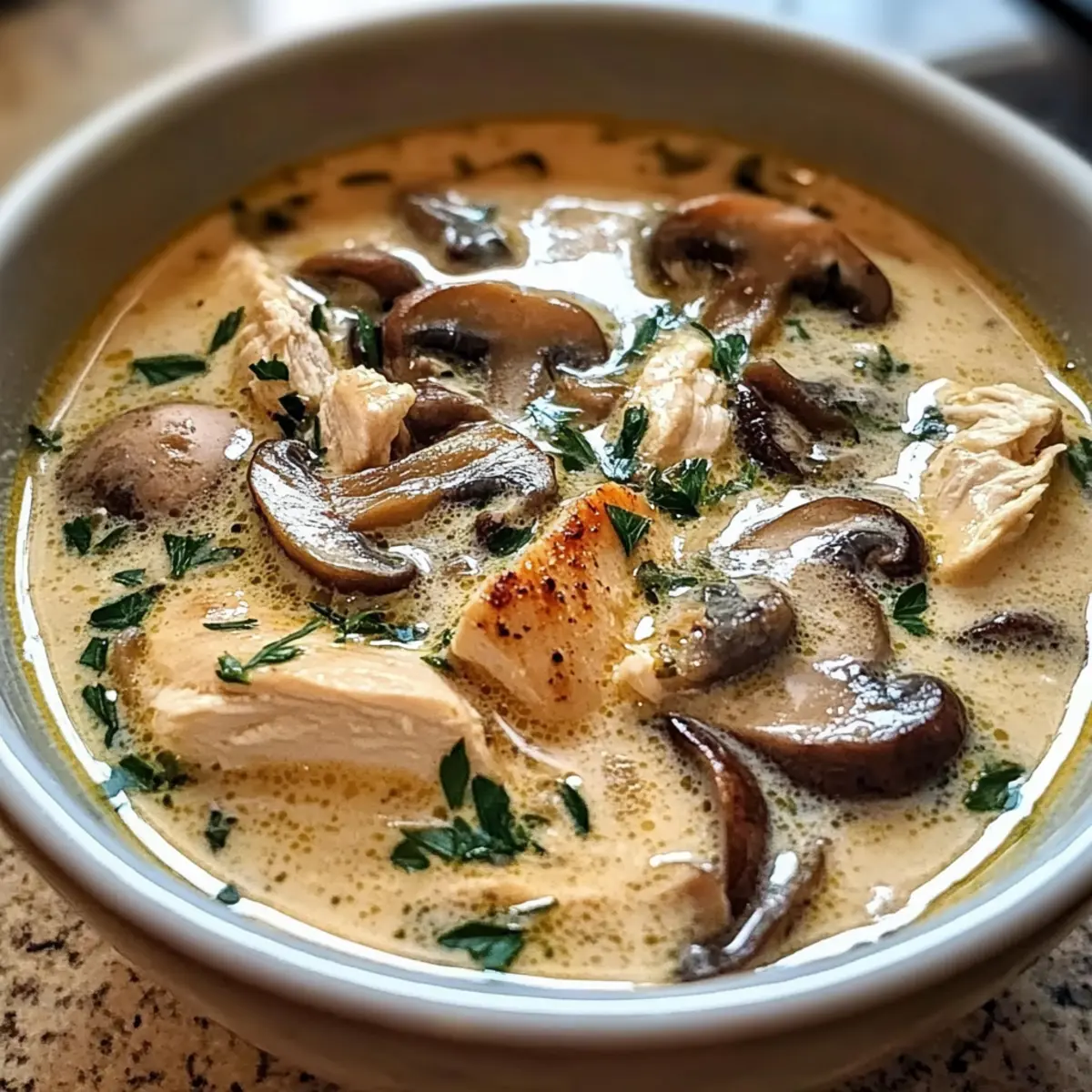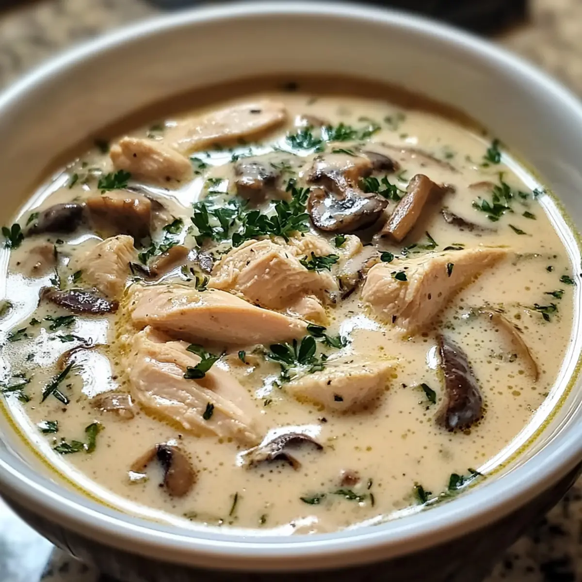 Reiche Aromen: Die Kombination aus zartem Hühnchen und erdigen Pilzen in einer samtigen Brühe sorgt für ein Geschmackserlebnis, das zum Schlemmen einlädt.