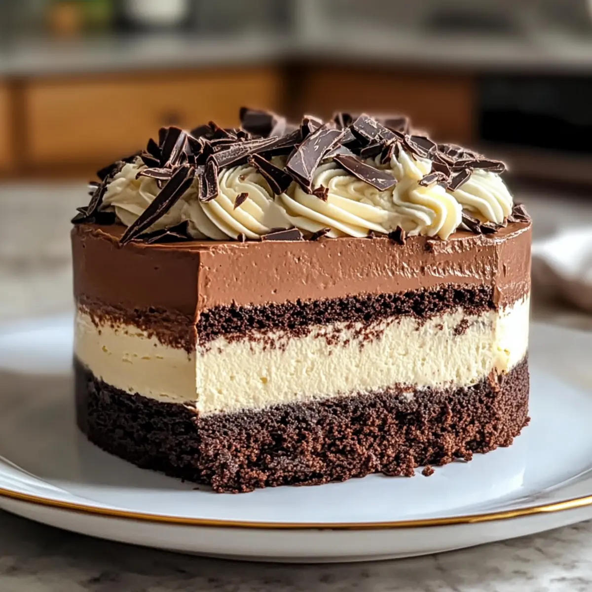 Einzigartiger Genuss: Der Dreifach Schokoladenmousse-Kuchen kombiniert die besten Schokoladensorten in einem einzigen, himmlischen Dessert.