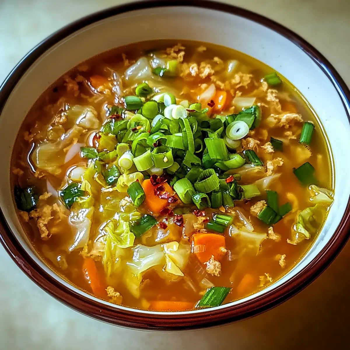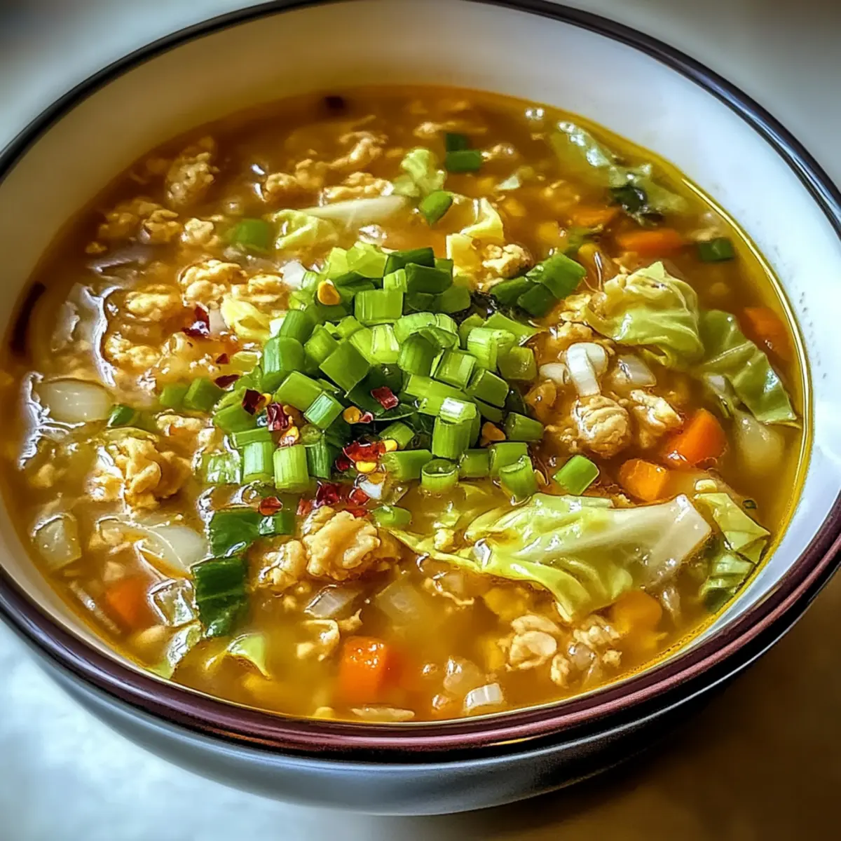 Schmecken Sie die Suppe ab und würzen Sie sie nach Belieben mit Salz und Pfeffer. Servieren Sie die Ein-Topf-Ei-Roll-Suppe heiß, garniert mit den zurückbehaltenen gehackten Frühlingszwiebeln und eventuell einem Spritzer Sriracha oder etwas roter Pfefferflocken für zusätzliche Schärfe.