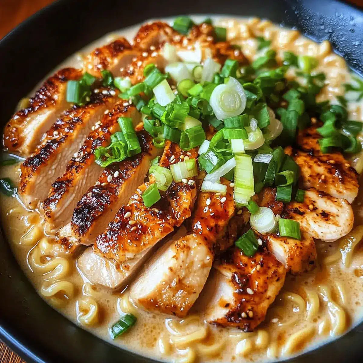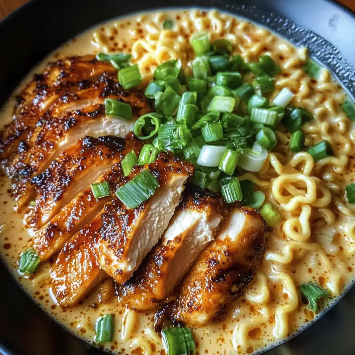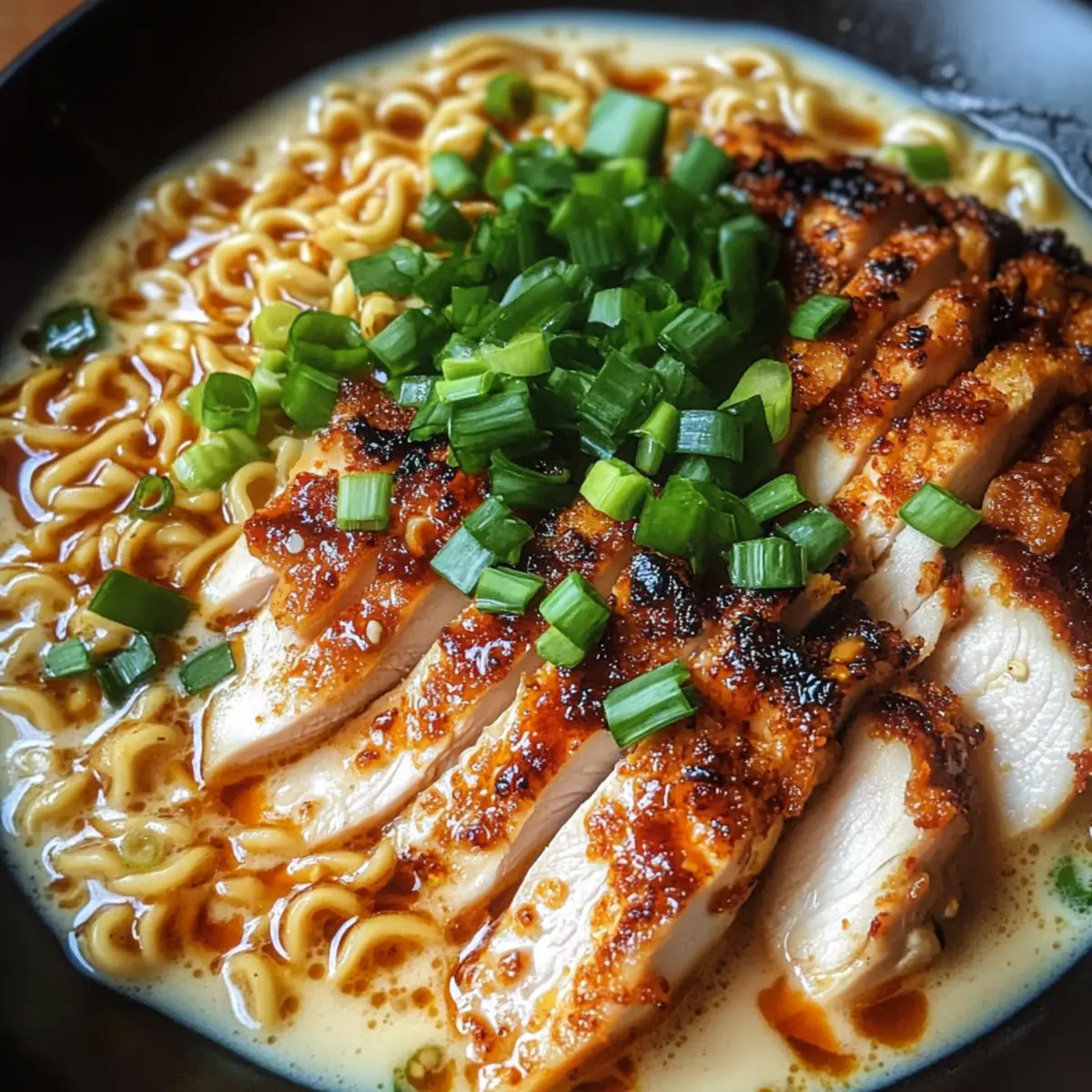 Bestreue die Ramen mit gehackten Frühlingszwiebeln, um zusätzliche Frische hinzuzufügen. Wenn du es gerne schärfer magst, träufle optional etwas Chili-Öl über dein Gericht. Serviere dein Feuriges Hähnchen Cremige Knoblauch Ramen sofort, damit alle Aromen und die cremige Textur am besten zur Geltung kommen.