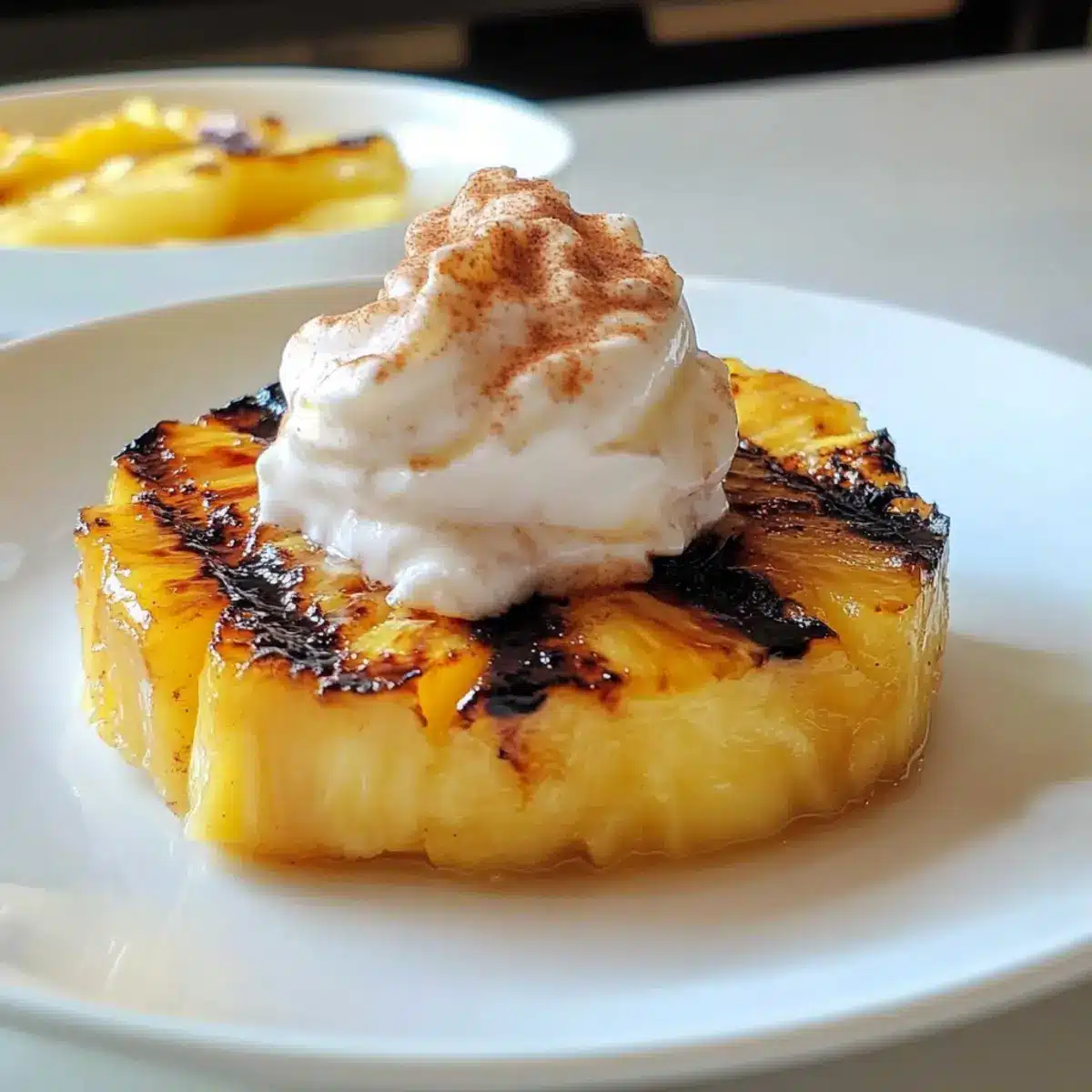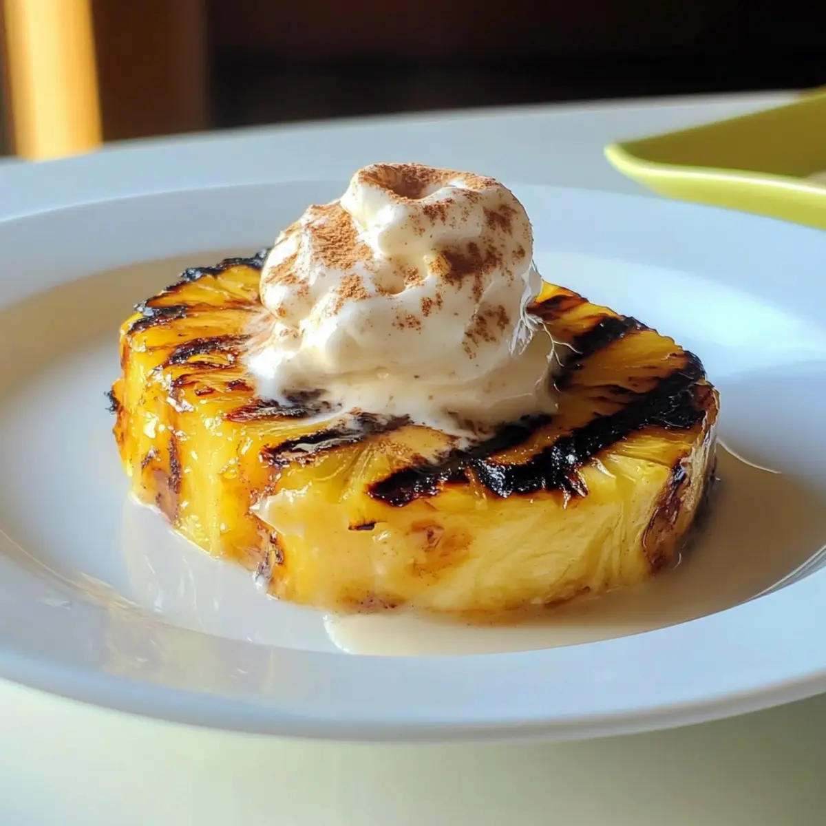 - Serviere die gegrillte Ananas warm mit der Kokosnuss-Zimt-Schlagsahne.
