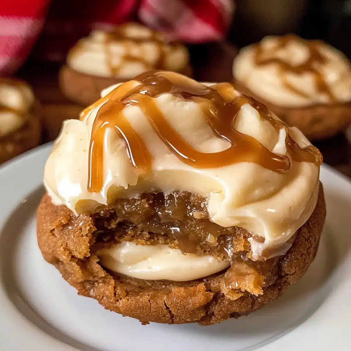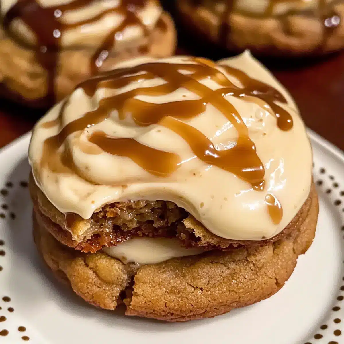 Sobald die Kekse abgekühlt sind, schlage die Buttercreme erneut auf, um sie luftig zu machen. Piepse die Buttercreme großzügig auf die Oberfläche jedes Kekses. Träufle die abgekühlte Toffeesauce über die bestrichenen Kekse, um eine köstliche Verbindung zu schaffen. Serviere sie frisch und genieße das himmlische Aroma dieser Klebrigen Toffee Pudding Kekse!