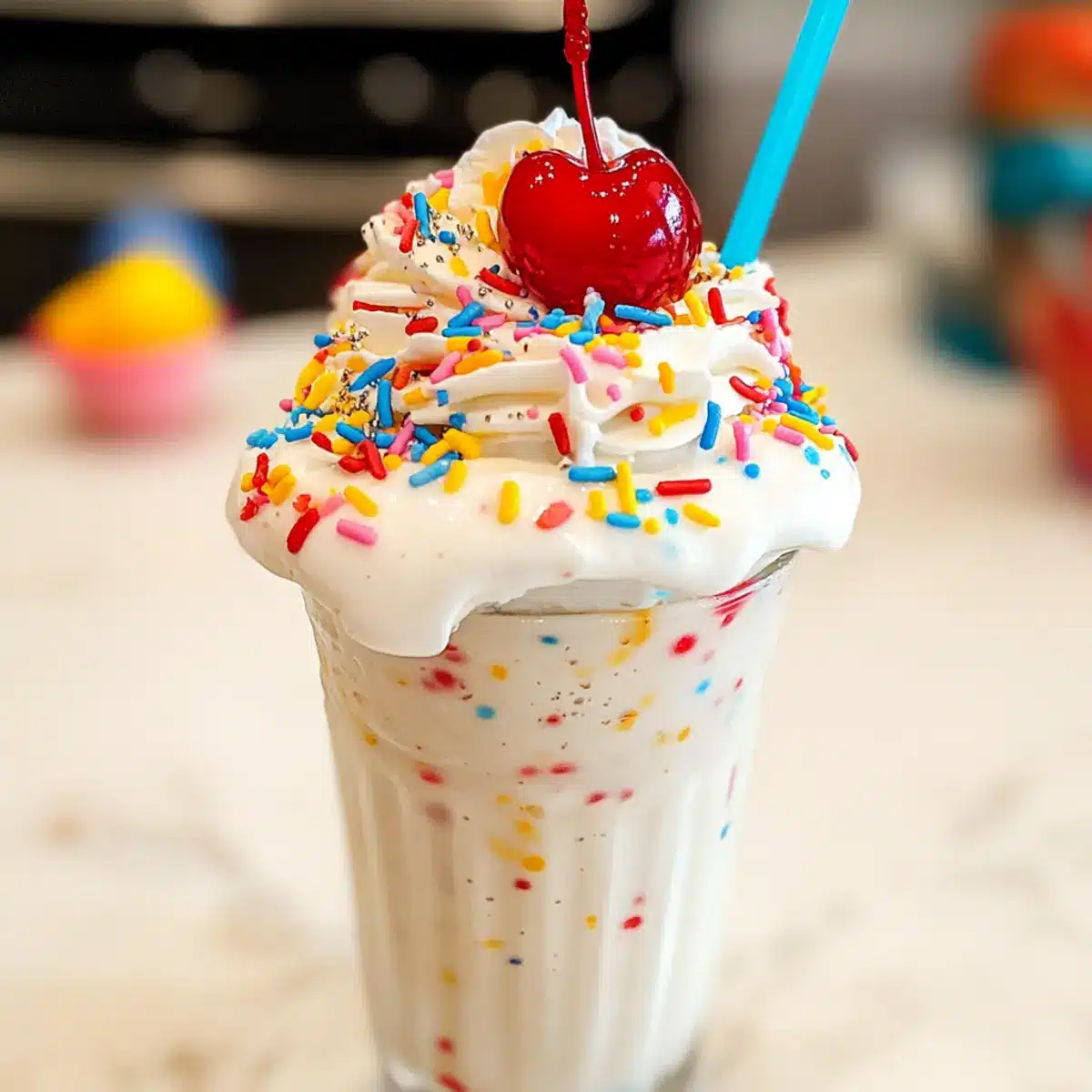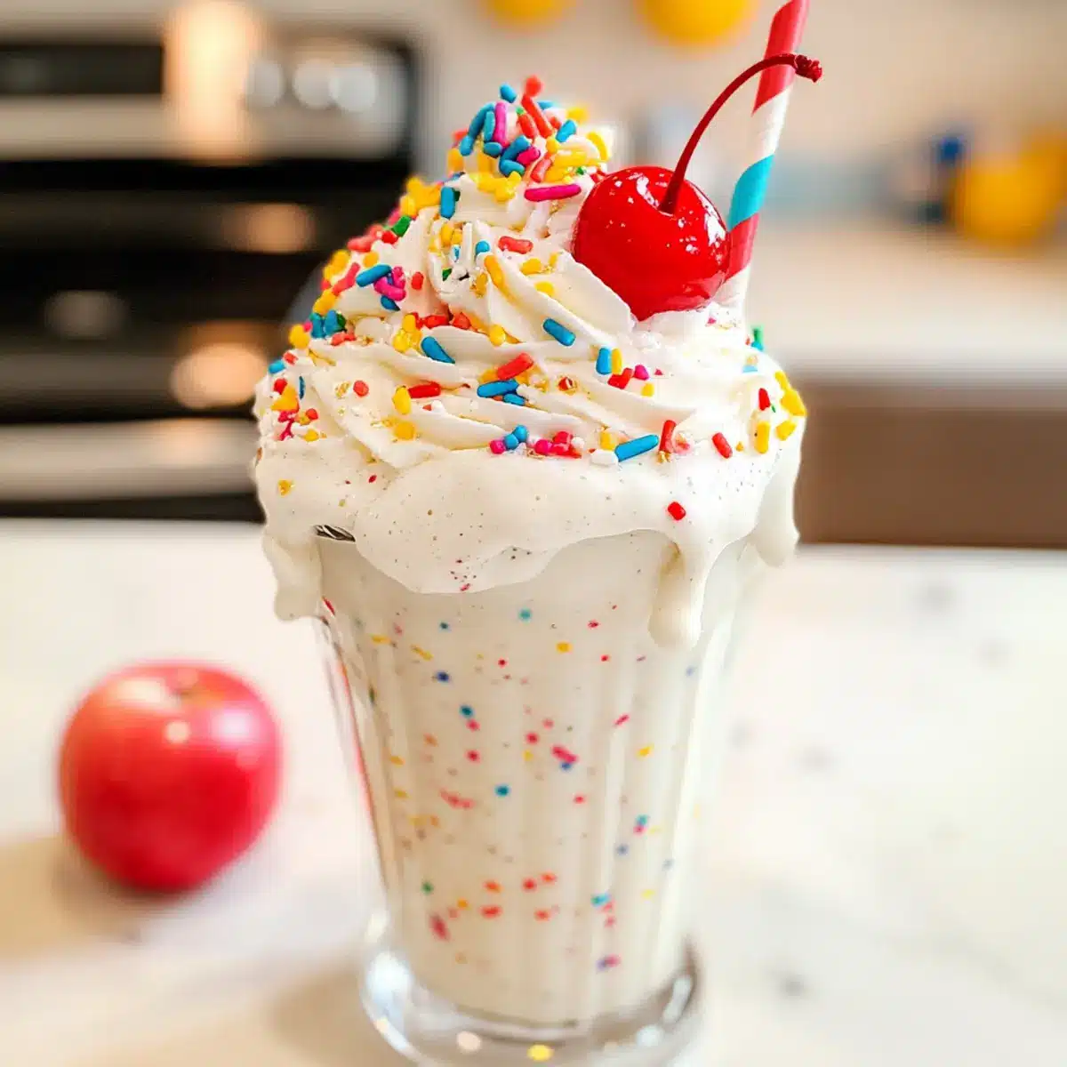 - Gieße den Kuchenteig Milchshake in Gläser und achte darauf, ihn schön hoch zu füllen. Garniere jeden Shake großzügig mit Schlagsahne, zusätzlichen Streuseln und einer Maraschino-Kirsche obenauf für die perfekte Präsentation.