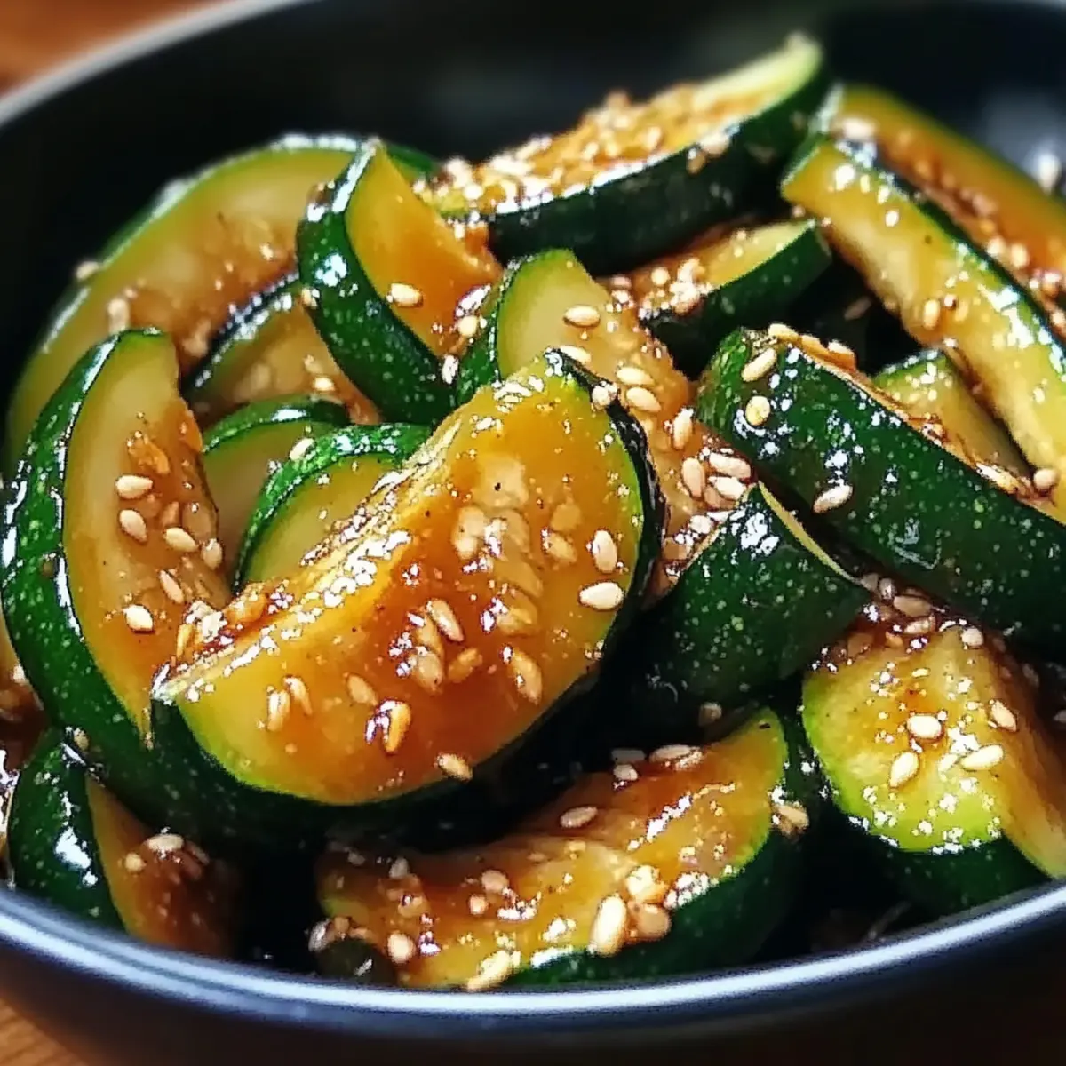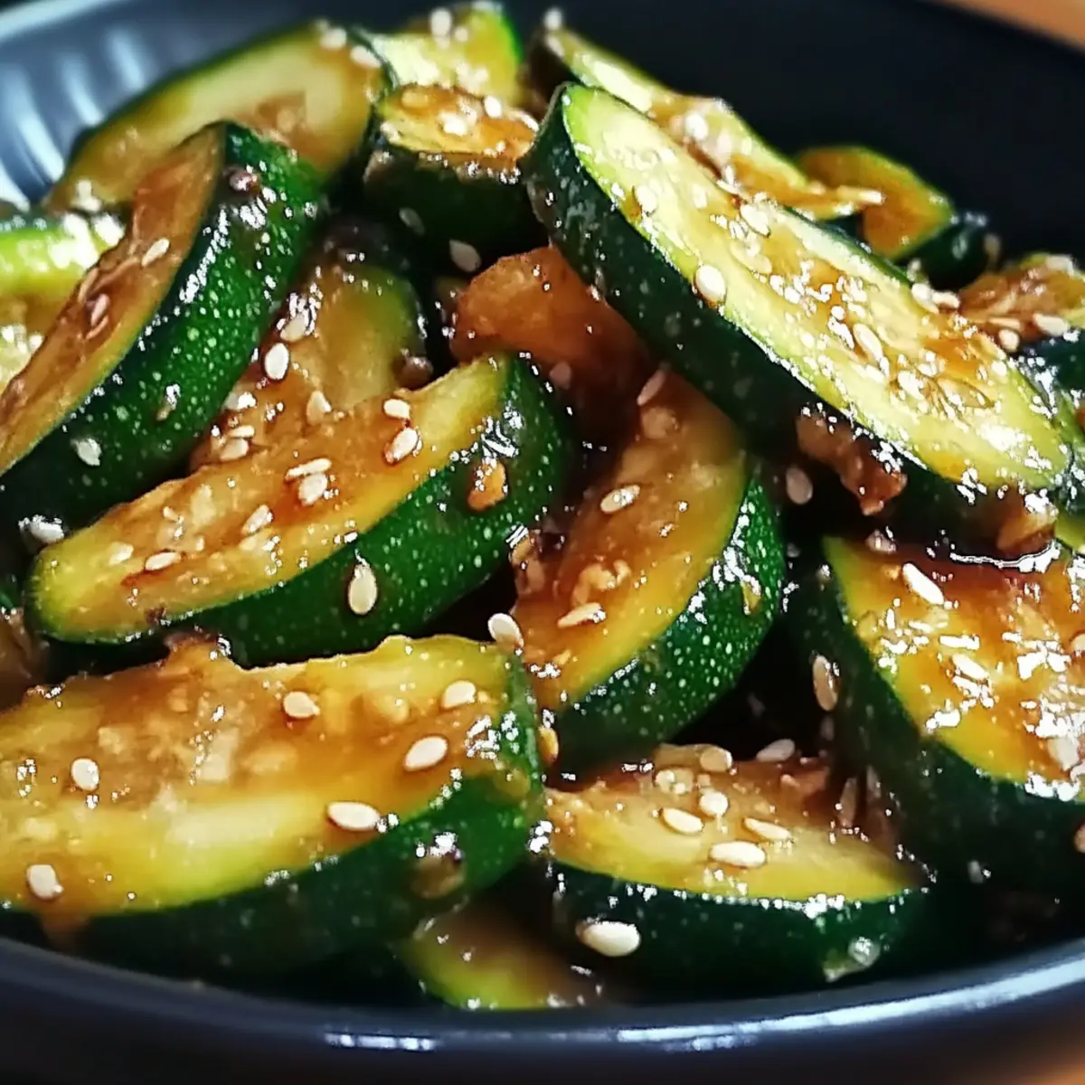 Nehme die Pfanne vom Herd und streue optional einige Sesamsamen über die Zucchini, um das Gericht zu garnieren. Serviere die leckere asiatische Zucchini-Beilage warm als Begleitung zu gegrilltem Fleisch oder Reis. Genieße diese gesunde und schmackhafte Beilage zu deinen Mahlzeiten!