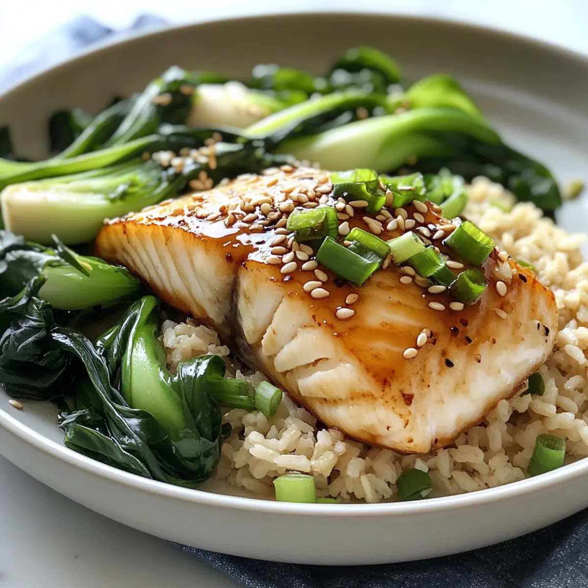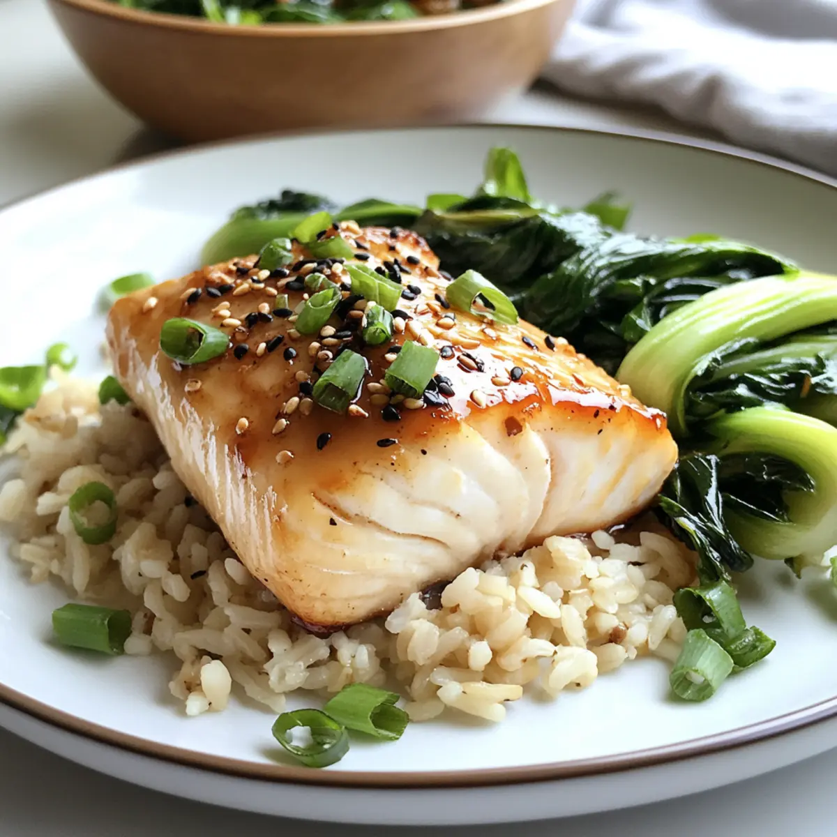 Servieroptionen: Genießen Sie den Miso-Soja-glasierten Heilbutt mit dampfendem braunem Reis und gehobelten Zucchini oder Spargel für ein erhöhtes Nährstoffprofil.