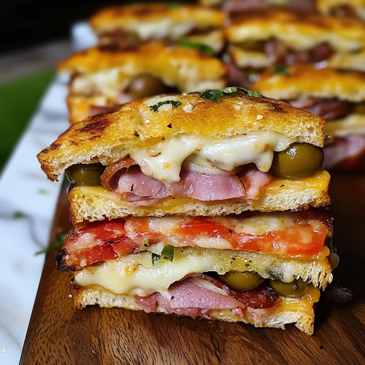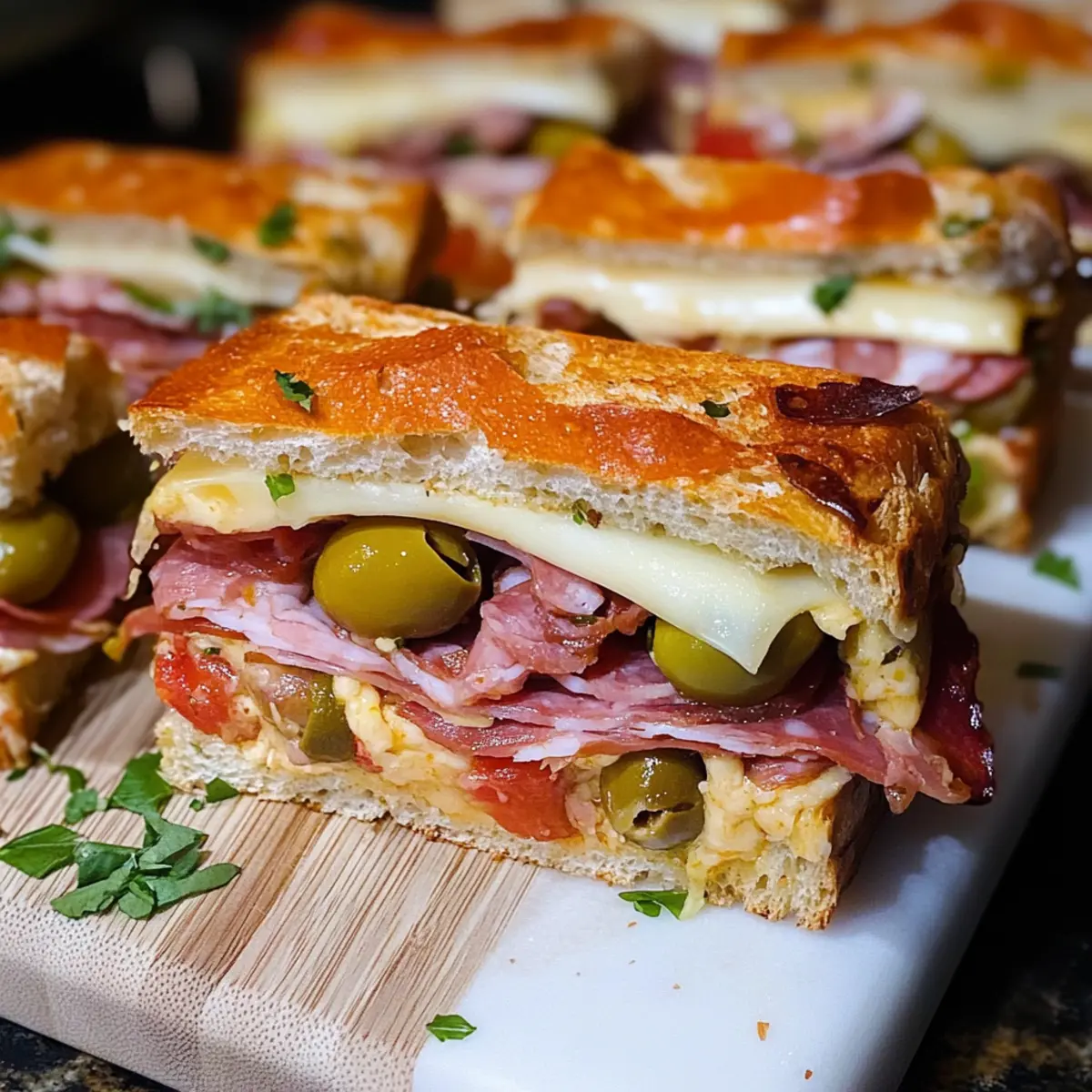 Zubereitung: Hier findest du alles, was du für diese köstlichen Muffaletta Sandwich Bissen benötigst, die garantiert jedem Schmaus eine besondere Note verleihen!