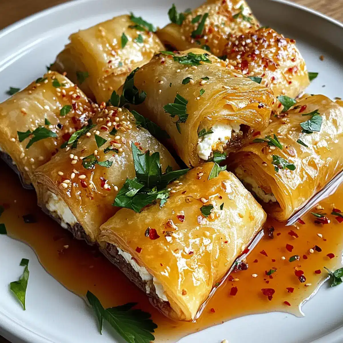 Es ist ein entspannter Abend, und während ich in der Küche stehe, duftet es nach frisch gebackenem Gebäck und würzigen Kräutern. Diese Ofen gebratenen Feta-Rollen mit Chili-Honig sind nicht nur einfach zuzubereiten, sondern auch der perfekte Appetizer, um jeden Anlass aufzupeppen. Mit ihrer knusprigen Phyllo-Hülle, die sich mit cremigem Feta und frischem Dill füllt, vereinen sie eine harmonische Mischung aus scharfen und süßen Aromen. Die Kombination aus dem herzhaften Käse und dem süß-würzigen Chili-Honig macht sie zu einem echten Genuss für alle, die abwechslungsreiche mediterrane Küche lieben. Wenn du auf der Suche nach einem Rezept bist, das schnell geht und bei deinen Freunden garantiert begeistert, dann sind diese Feta-Rollen genau das Richtige! Welche geheimen Zutaten würdest du hinzufügen, um noch mehr Geschmack zu kreieren?
