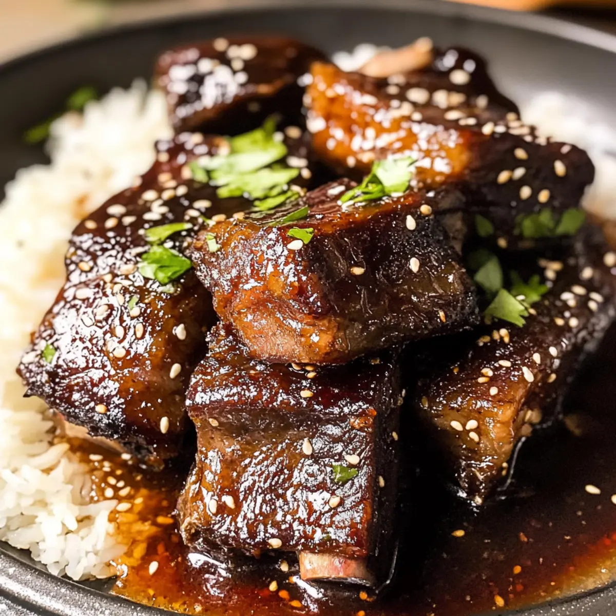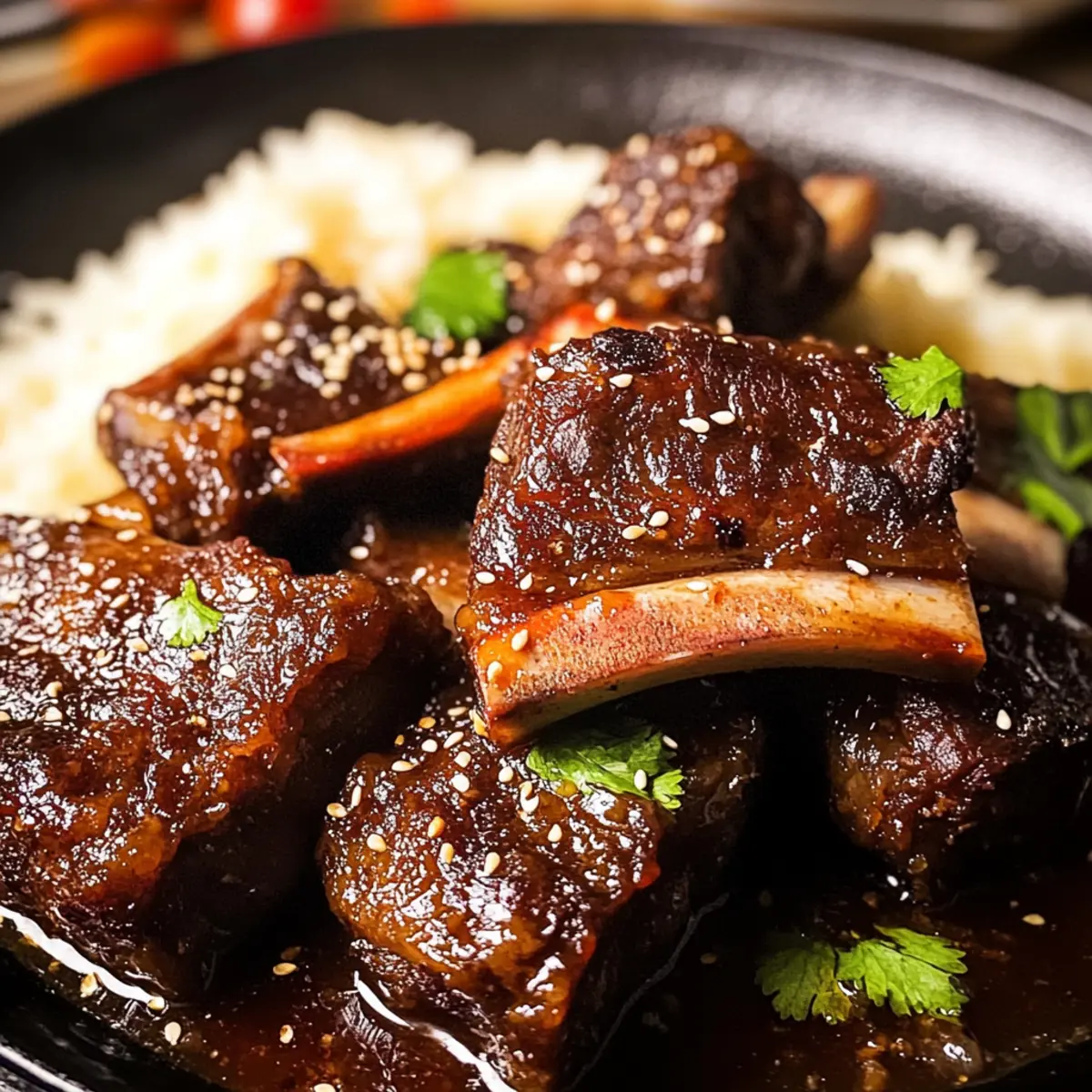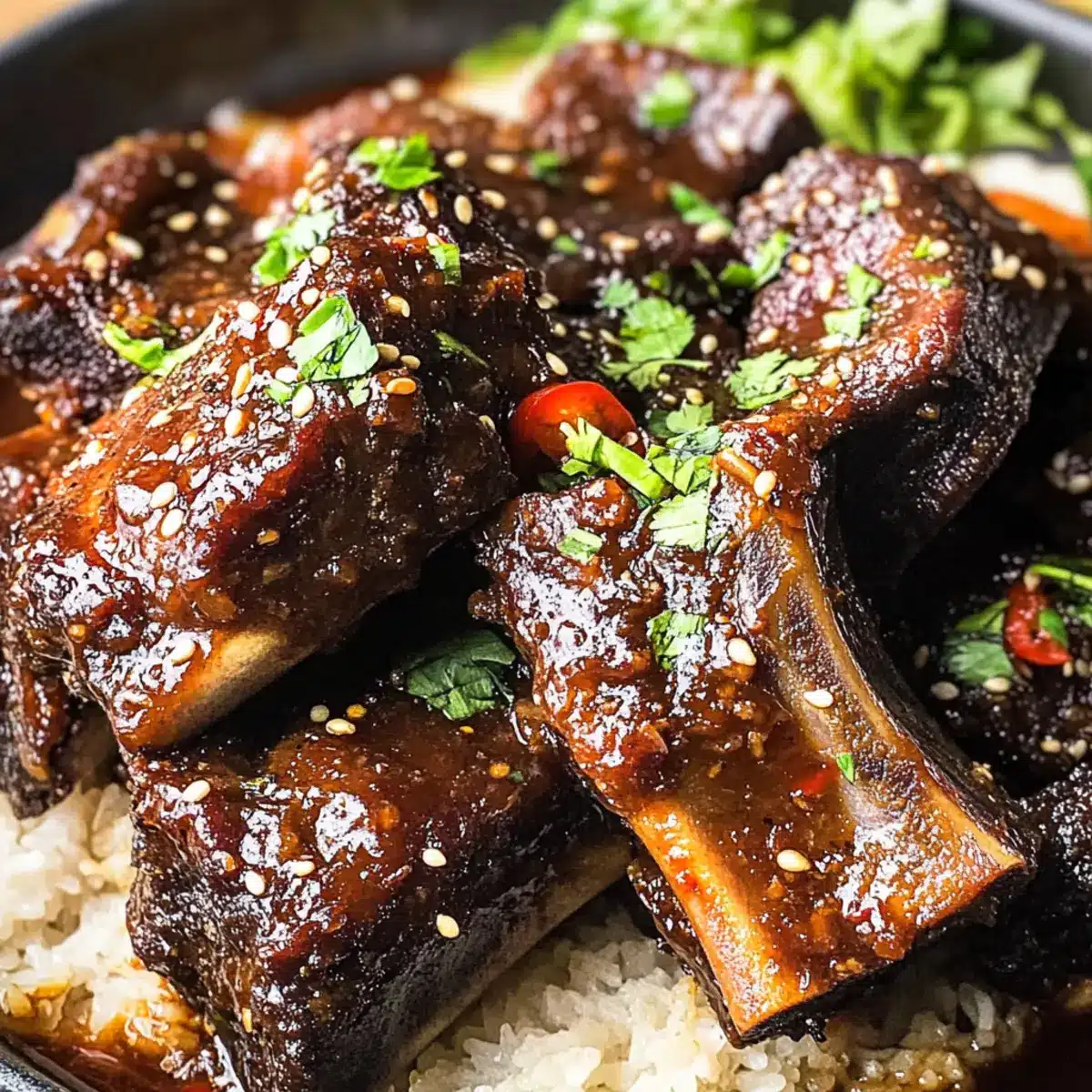 Nehme die Ofen geschmorten koreanischen Rinderknochen aus dem Ofen und lasse sie kurz ruhen. Serviere die Rinderknochen über dampfendem Jasminreis und garniere das Gericht mit frischem Chili-Pfeffer, Frühlingszwiebeln, Koriander und Sesamsamen für einen zusätzlichen Farbtupfer und Geschmack.