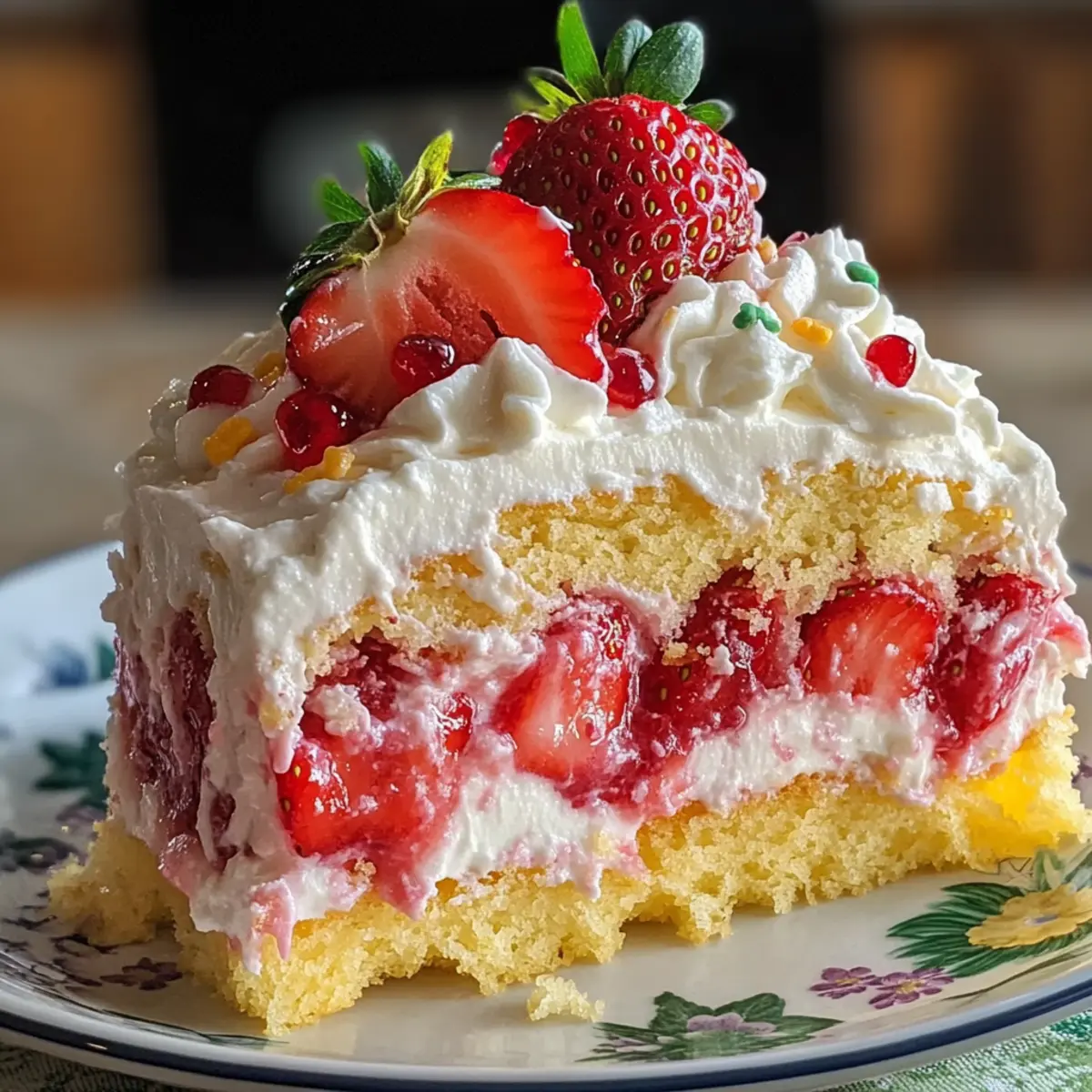 Nachdem die Füllung gut durchgezogen ist, nimm den Kuchen aus dem Kühlschrank und verteile eine großzügige Schicht Schlagsahne über die Oberfläche. Garnieren den Kuchen mit frischen Erdbeeren und streue einige Pastellstreusel darüber, um ein festliches Aussehen zu erzielen. Achte darauf, die Erdbeeren gleichmäßig zu platzieren, damit der Kuchen einladend aussieht.