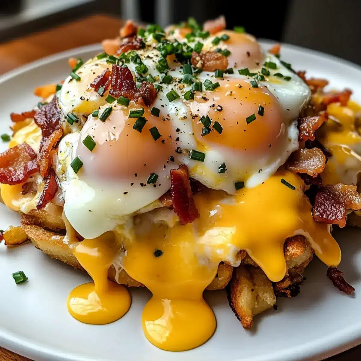 In tiefen Tellern oder Schalen die heiß gebackenen Hash Browns gleichmäßig verteilen. Mit geriebenem Cheddar und Mozzarella bestreuen, gefolgt von warmer Bratensoße und der vorbereiteten Hollandaise. Schließlich die zerbröselte Bacon und die pochierten Eier darauflegen und nach Wunsch mit frischem Schnittlauch oder Petersilie garnieren.