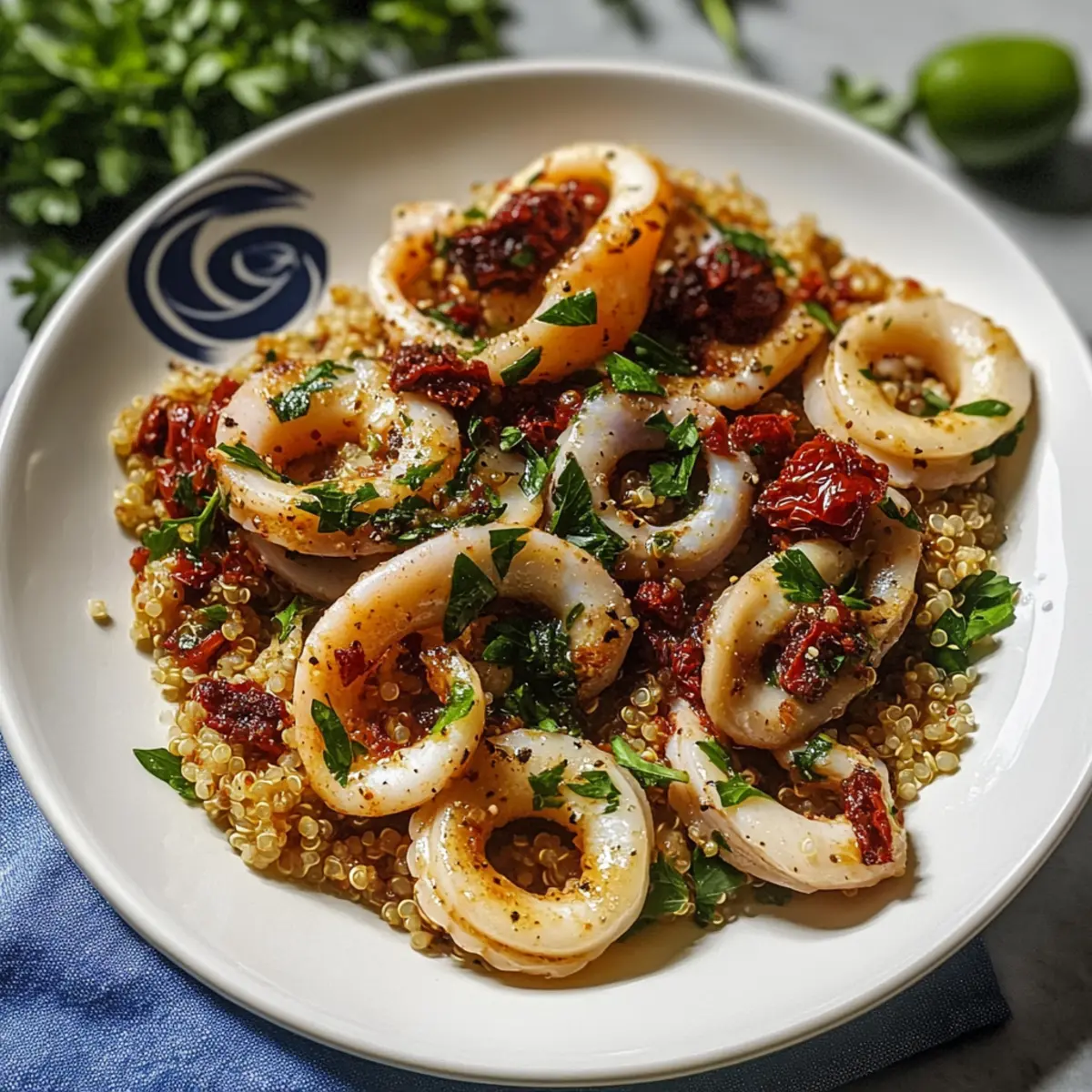 - Serviere die Tintenfische heiß über Quinoa und garniere nach Belieben.