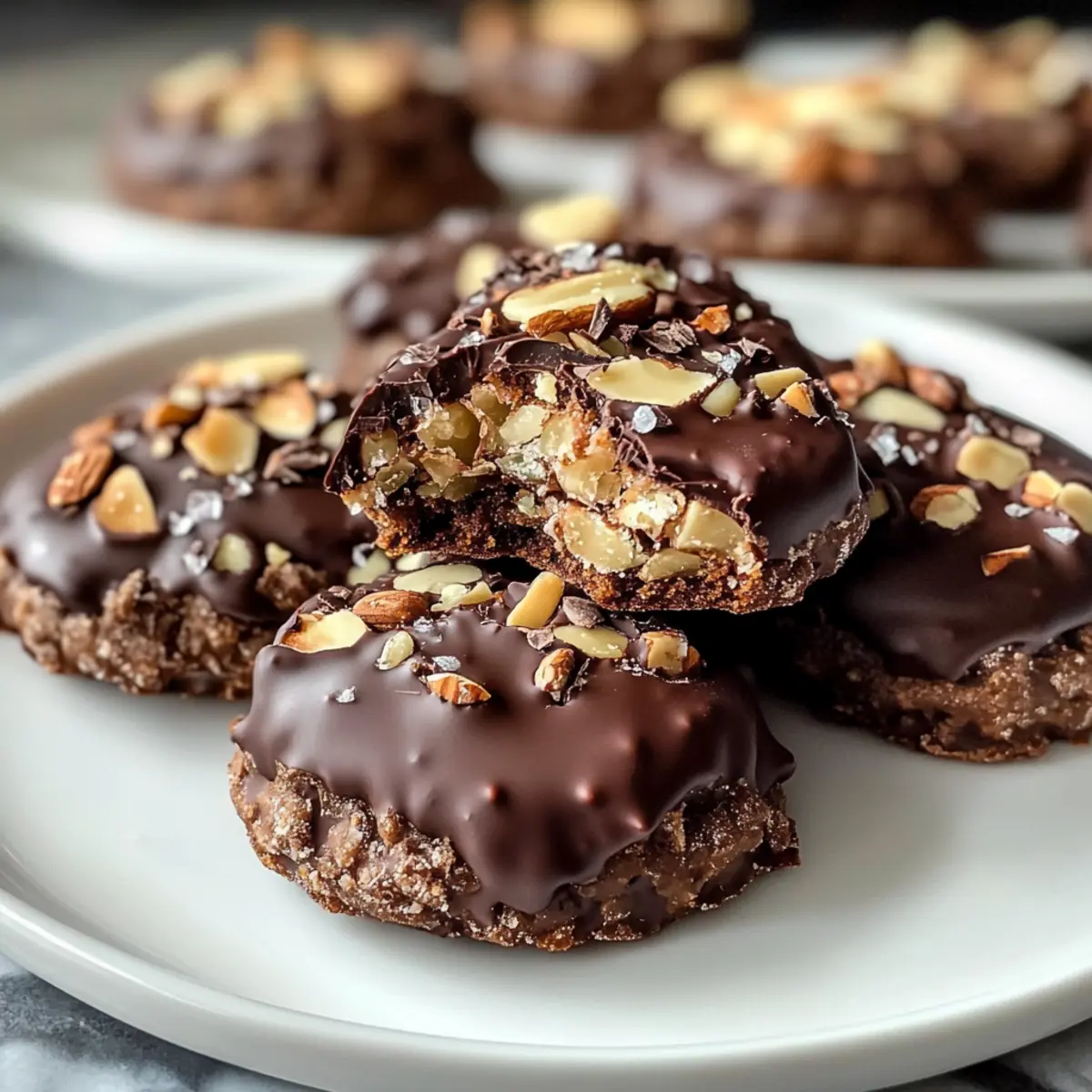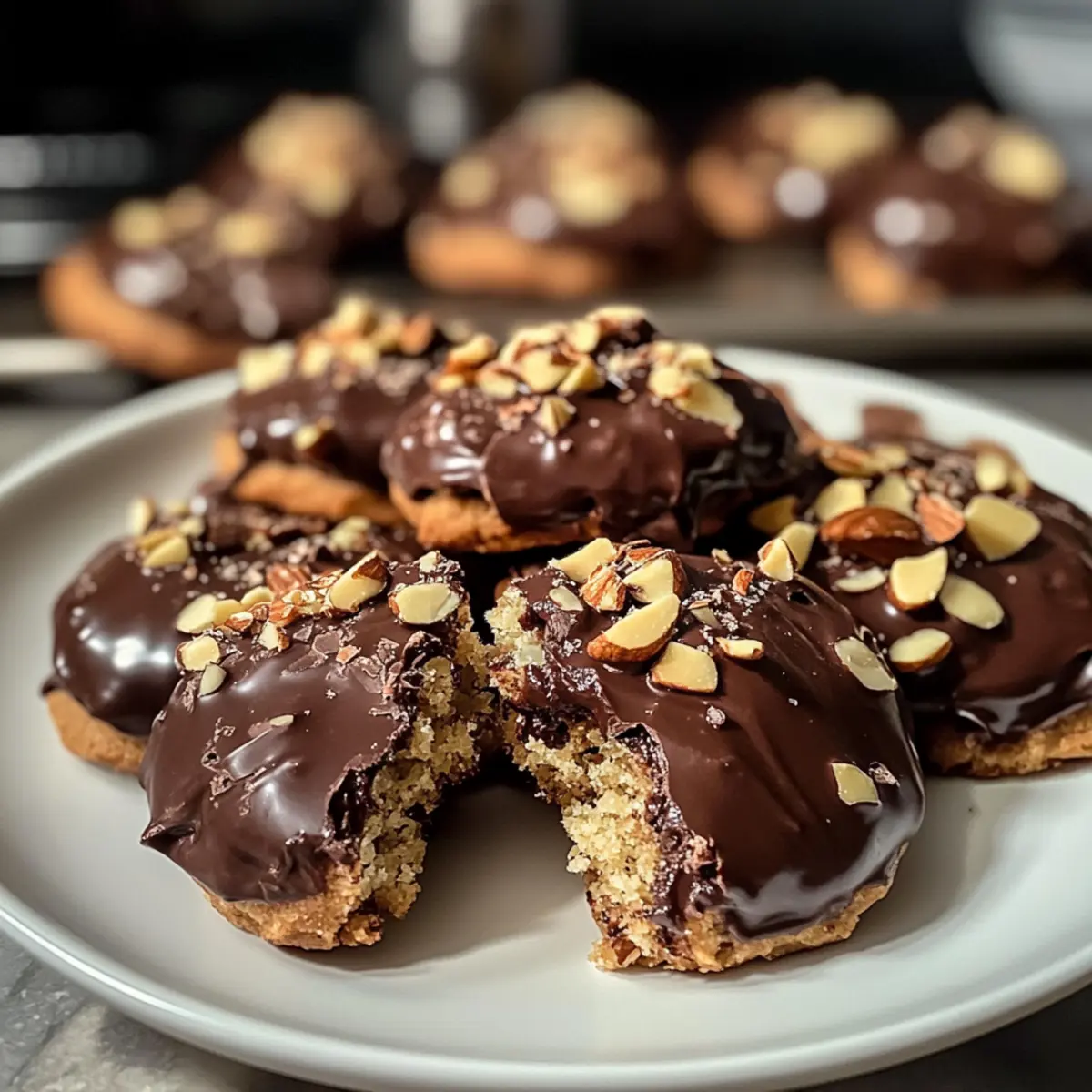 - Schmelze die Schokoladenglasur und tauche die Plätzchen hinein. Bestreue sie mit gehackten Mandeln.