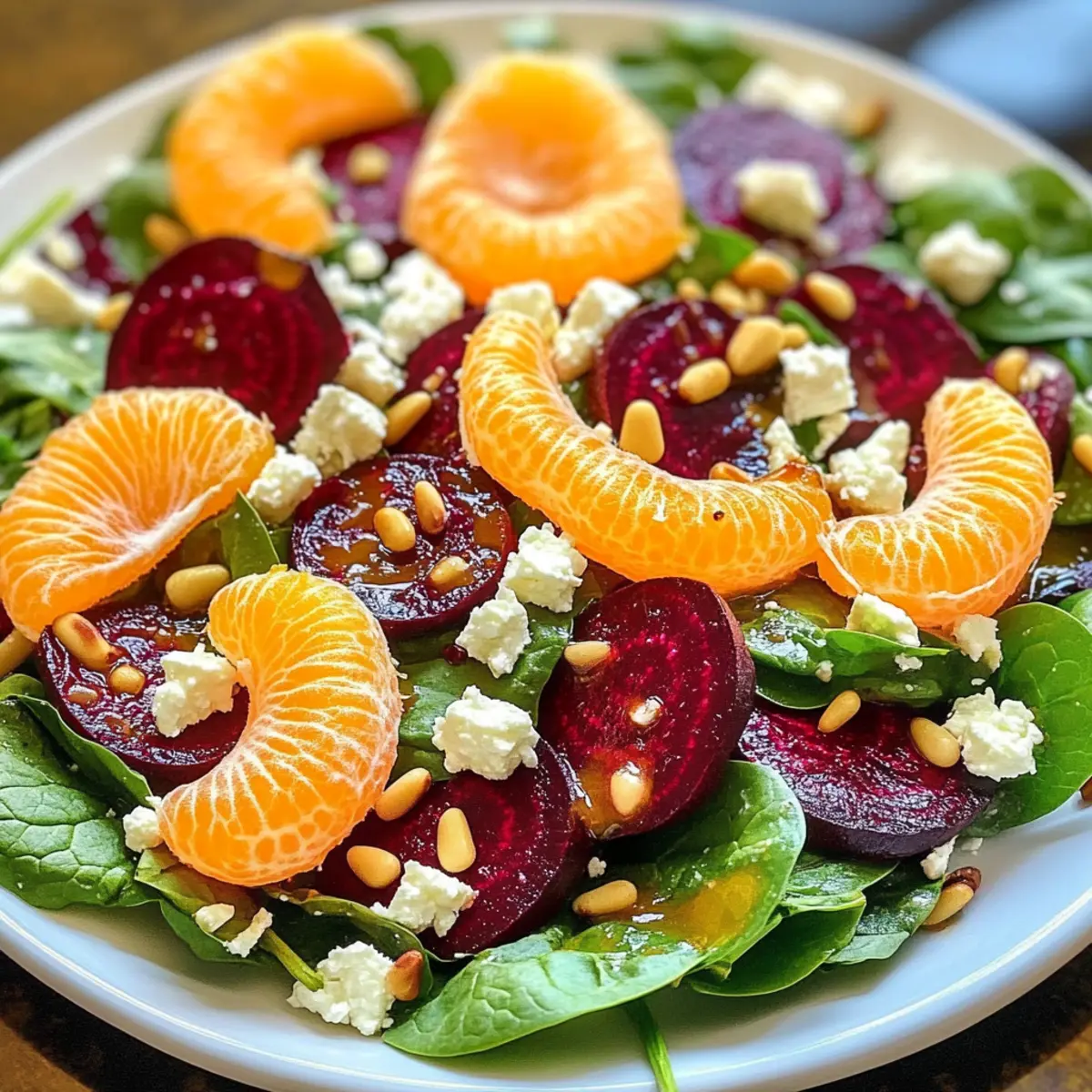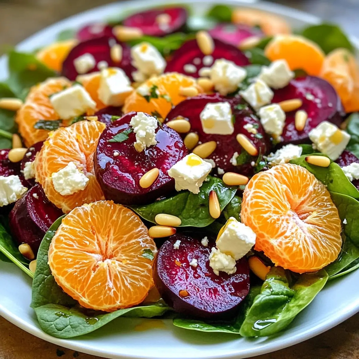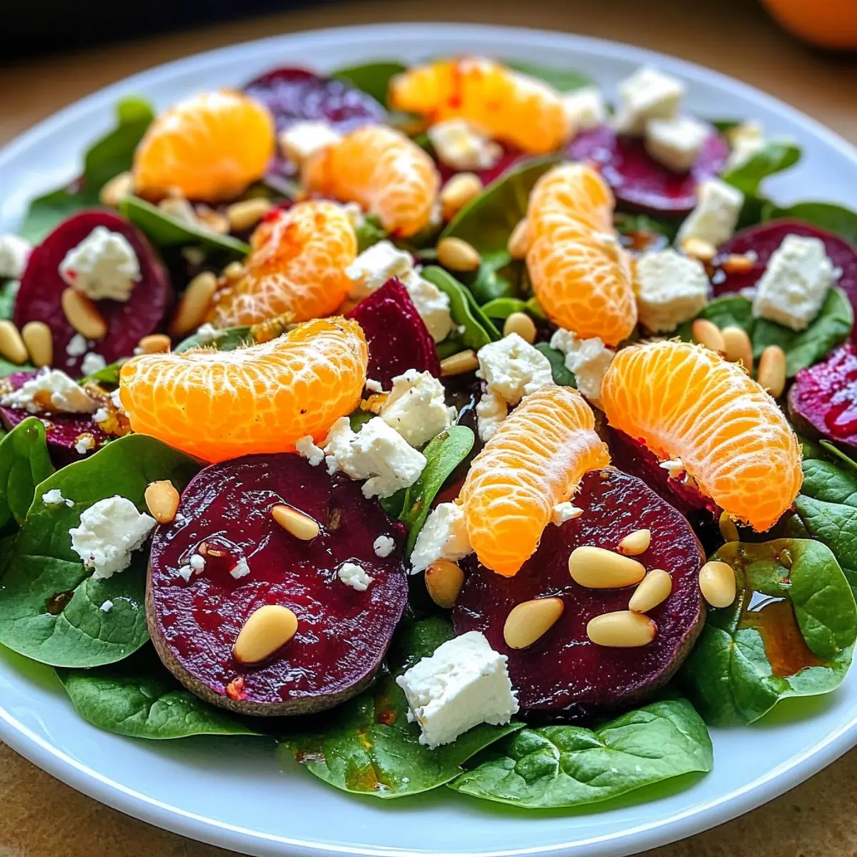 - Nimm eine große Schüssel und gib 150 g frischen Babyspinat hinein. Füge die geschnittenen Rote Bete, 100 g Mandarinenfilets und 50 g zerbröselten Feta-Käse hinzu. Streue zudem 30 g geröstete Pinienkerne über die Mischung.