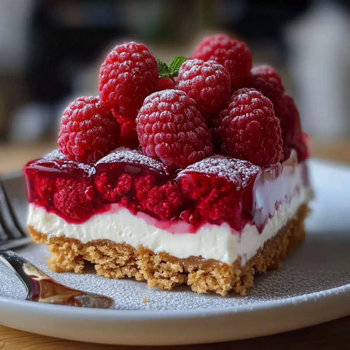 Servieren: Vor dem Servieren das Dessert nach dem Kühlprozess in Stücke schneiden und für ein besonders schönes Erscheinungsbild mit frischen Himbeeren oder Minzblättern garnieren.
