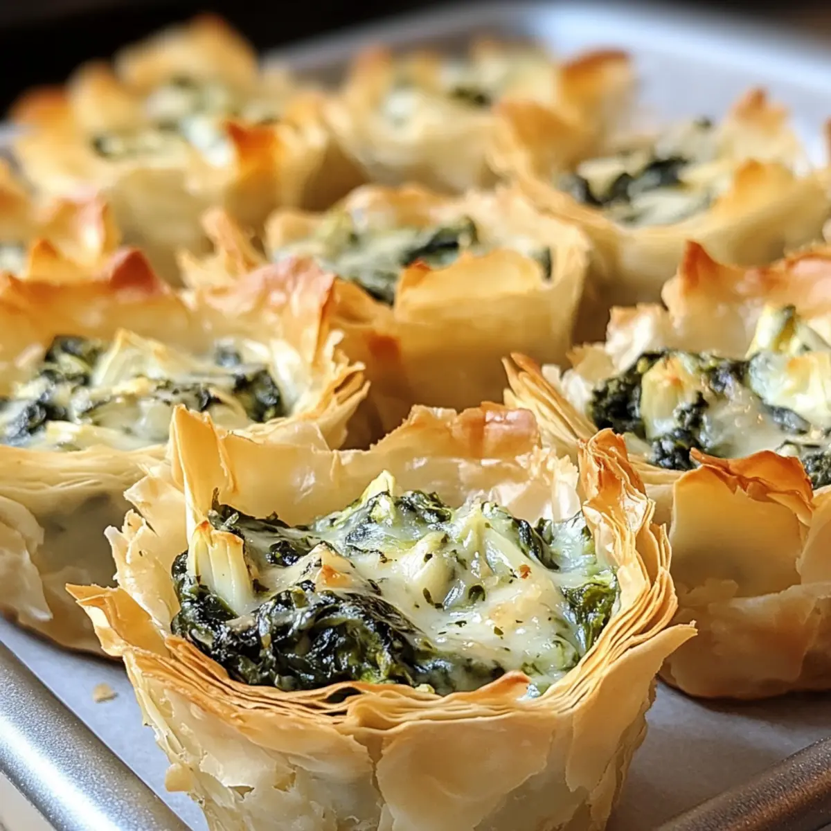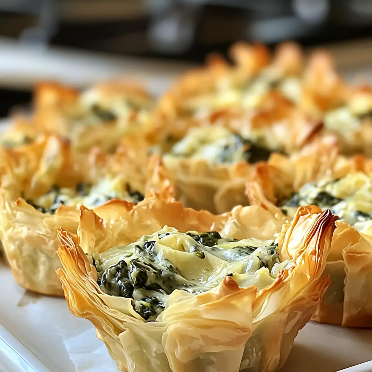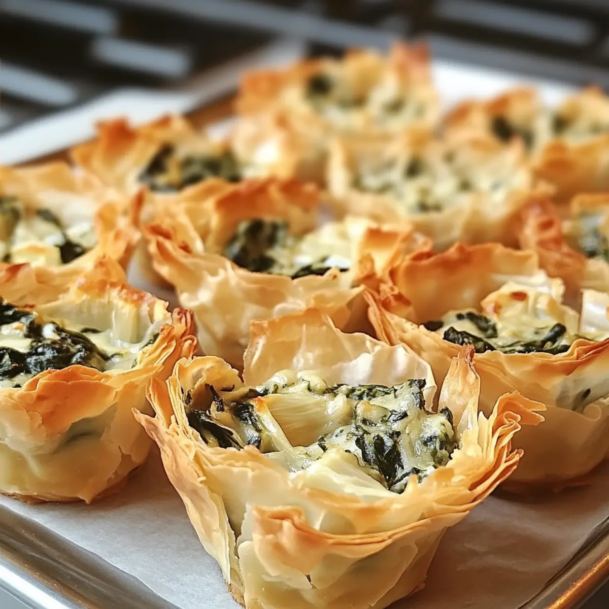 Die krossen Spinat- und Artischocken-Dip-Tassen sind ideal für die Vorbereitung im Voraus! Du kannst die Füllung (Spinat, Artischocken, Käse und Gewürze) bis 3 Tage im Voraus zubereiten und im Kühlschrank aufbewahren. Einfach die Zutaten gut vermischen und in einem luftdichten Behälter lagern, um die Frische zu bewahren. Der Filoteig kann ebenfalls bereits vorbereitet werden – schneide ihn in quadratische Stücke und lege sie in die Muffinform; diese kannst du bis zu 24 Stunden im Voraus auslegen. Wenn du bereit bist zu backen, fülle einfach die vorbereitete Mischung in die Tassen und backe sie bei 190°C für 18-20 Minuten. Dadurch erhältst du mit minimalem Aufwand ein köstliches Ergebnis, das nicht nur geschmacklich, sondern auch optisch begeistert!