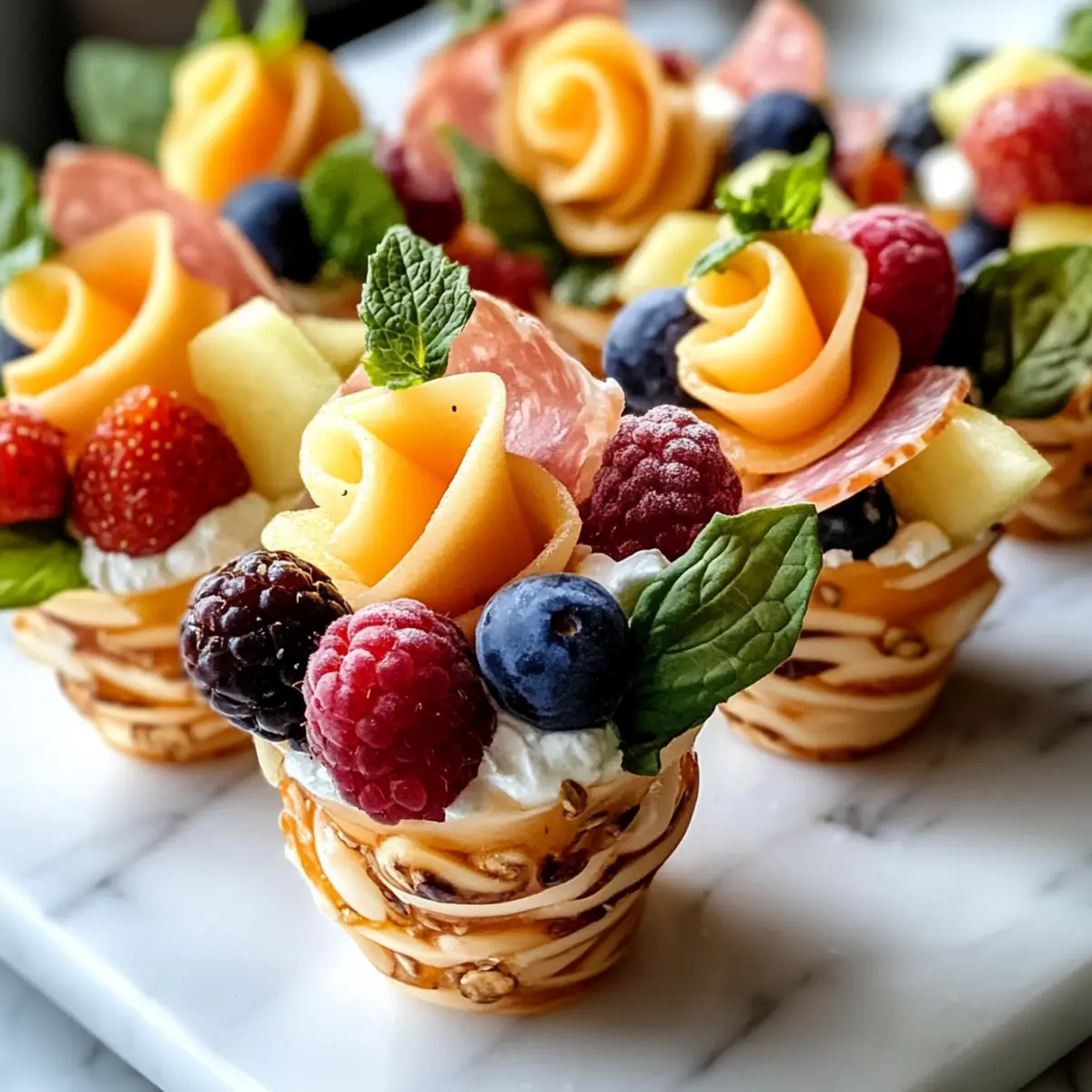 Plane voraus und vereinfache deine Morgen mit den unwiderstehlichen Frühstücks-Charcuterie-Bechern! Du kannst die meisten Zutaten bis zu 24 Stunden im Voraus vorbereiten. Beginne damit, die Früchte wie Cantaloupe und Cuties in der Nacht vorher zu schneiden und in luftdichte Behälter zu packen, um ihre Frische zu bewahren. Außerdem kannst du die Käse- und Granolaportionen bereits am Abend vorher zusammenstellen. Halte die frisch gewaschenen Beeren separat, um eine matschige Textur zu vermeiden. Am Morgen einfach alle Komponenten in die Becher füllen, die Spieße anrichten und mit frischer Minze garnieren – voila, ein stressfreies Frühstück, das genauso köstlich bleibt!