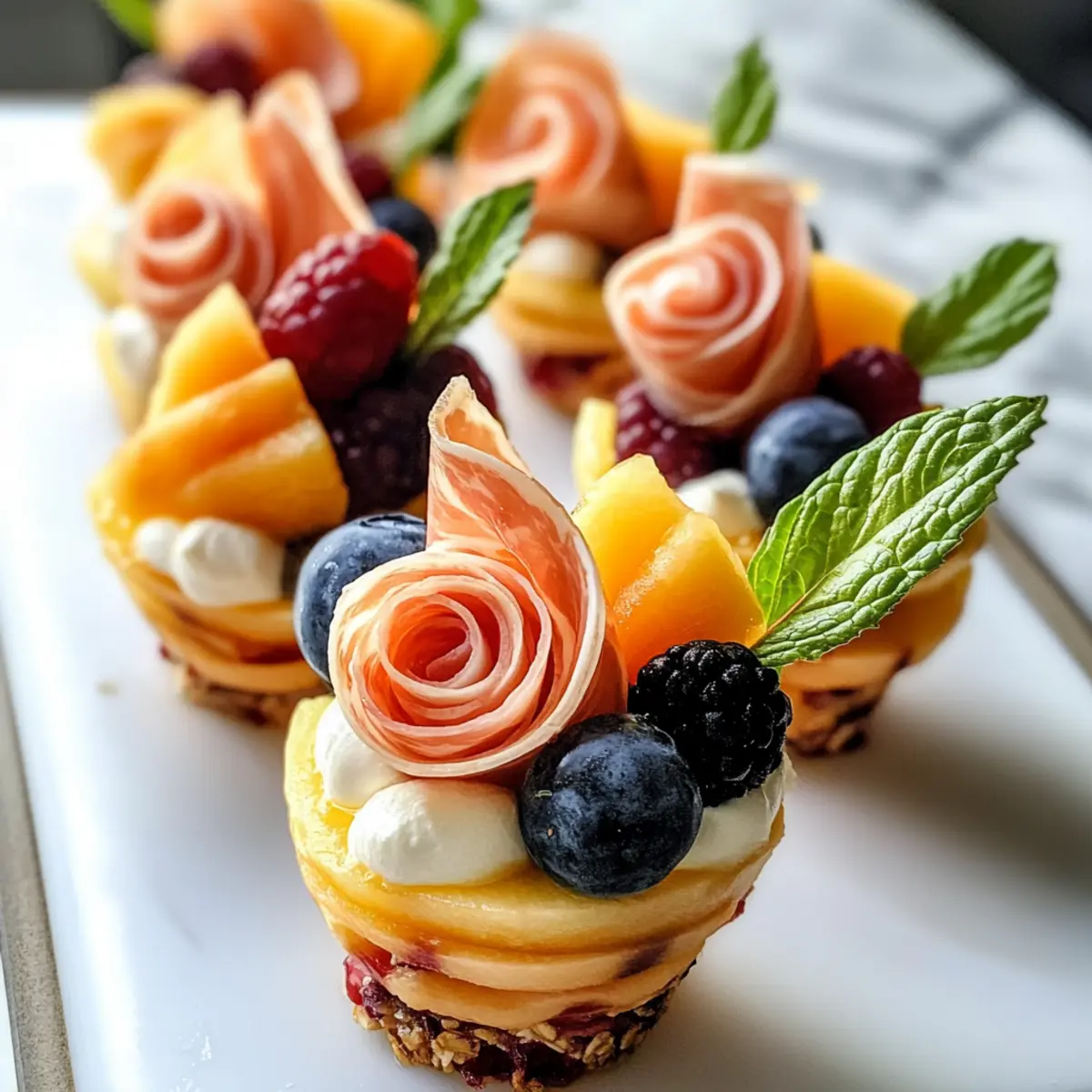 Nimm Holzspieße oder Schaschlikstäbchen und stecke spiralförmige Prosciutto-Stücke und saftige Cantaloupe-Bällchen auf. Achte darauf, die Zutaten so zu platzieren, dass sie gut sichtbar und aufgereiht sind, sodass die Farben harmonisch miteinander kombiniert werden. Dies verleiht deinen Frühstücks-Charcuterie-Bechern einen tollen visuellen Effekt.