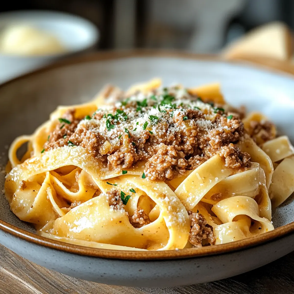 Kurz bevor du die Soße servierst, füge 50 g frisch geriebenen Parmesan hinzu und rühre gut um, bis der Käse geschmolzen und gleichmäßig verteilt ist. Dies verleiht der weißen Bolognese-Soße den gewünschten cremigen Charakter und eine köstliche umami Note.