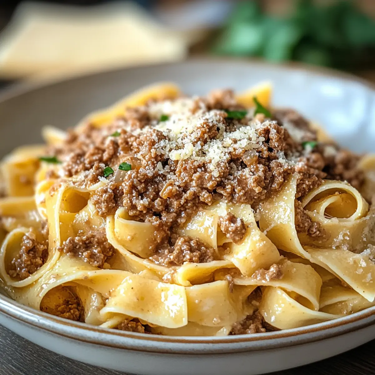 Die köstliche weiße Bolognese-Soße ist jetzt fertig! Über deine bevorzugte Pasta, wie Pappardelle oder Rigatoni, servieren. Genieß dein Gericht heiß und verwandele einfaches Pasta zu einem exquisiten Erlebnis, das den Geschmack Italiens direkt zu dir nach Hause bringt.