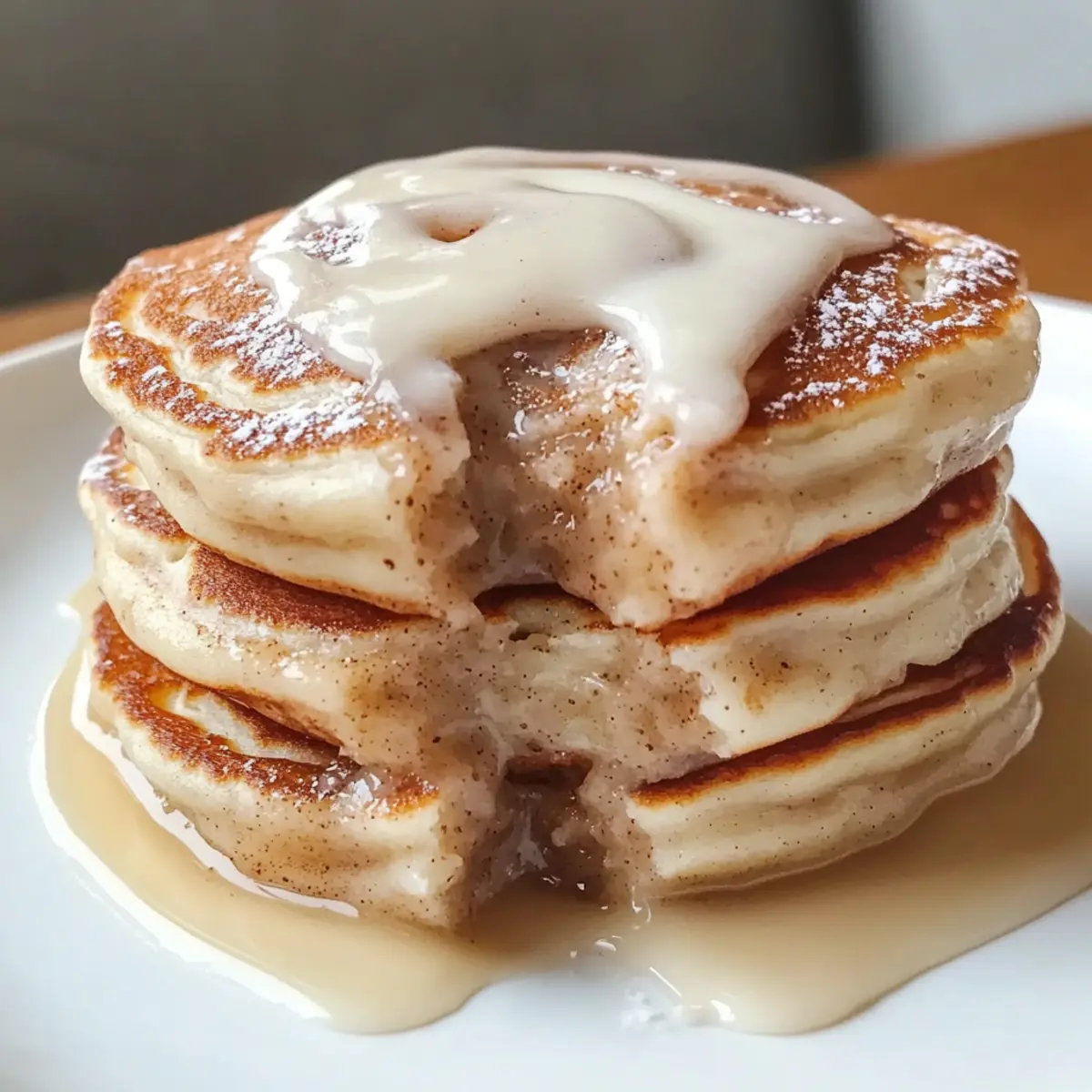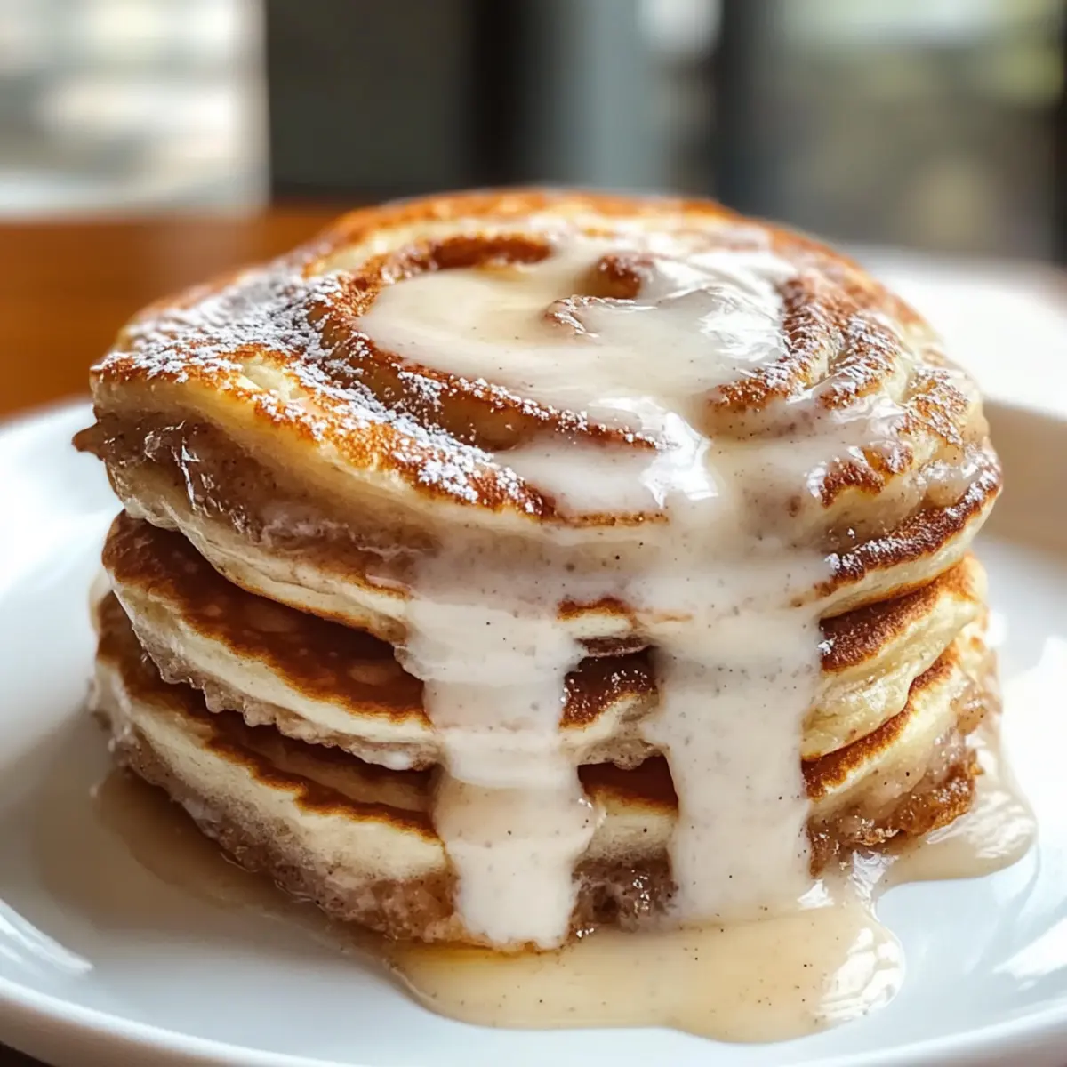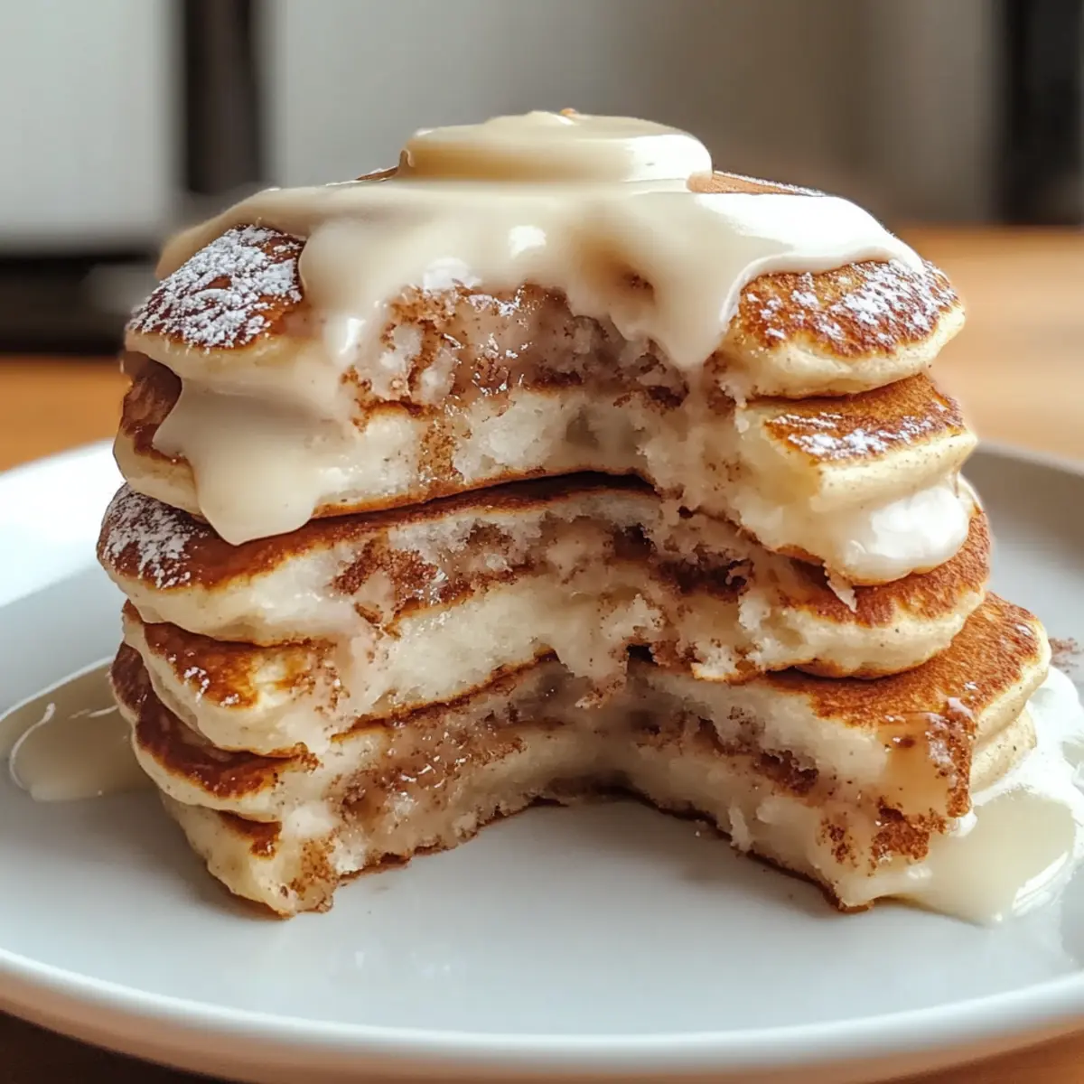 - Staple die frisch gebratenen Zimtschnecken-Pfannkuchen auf einem Teller und beträufle sie mit der vorbereiteten Frischkäseglasur.
