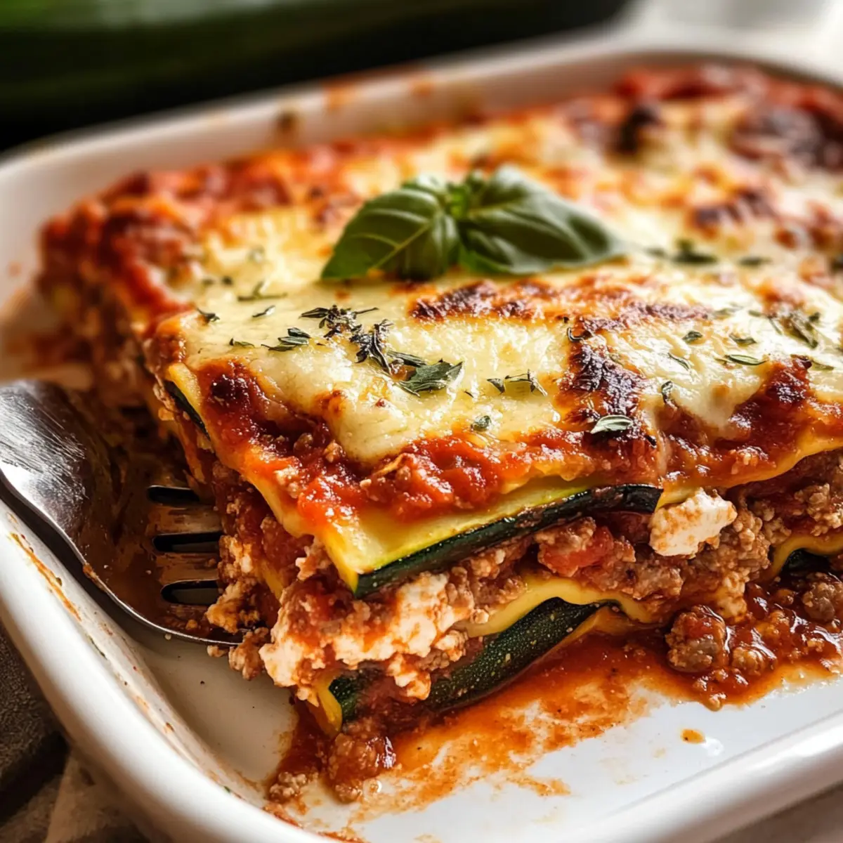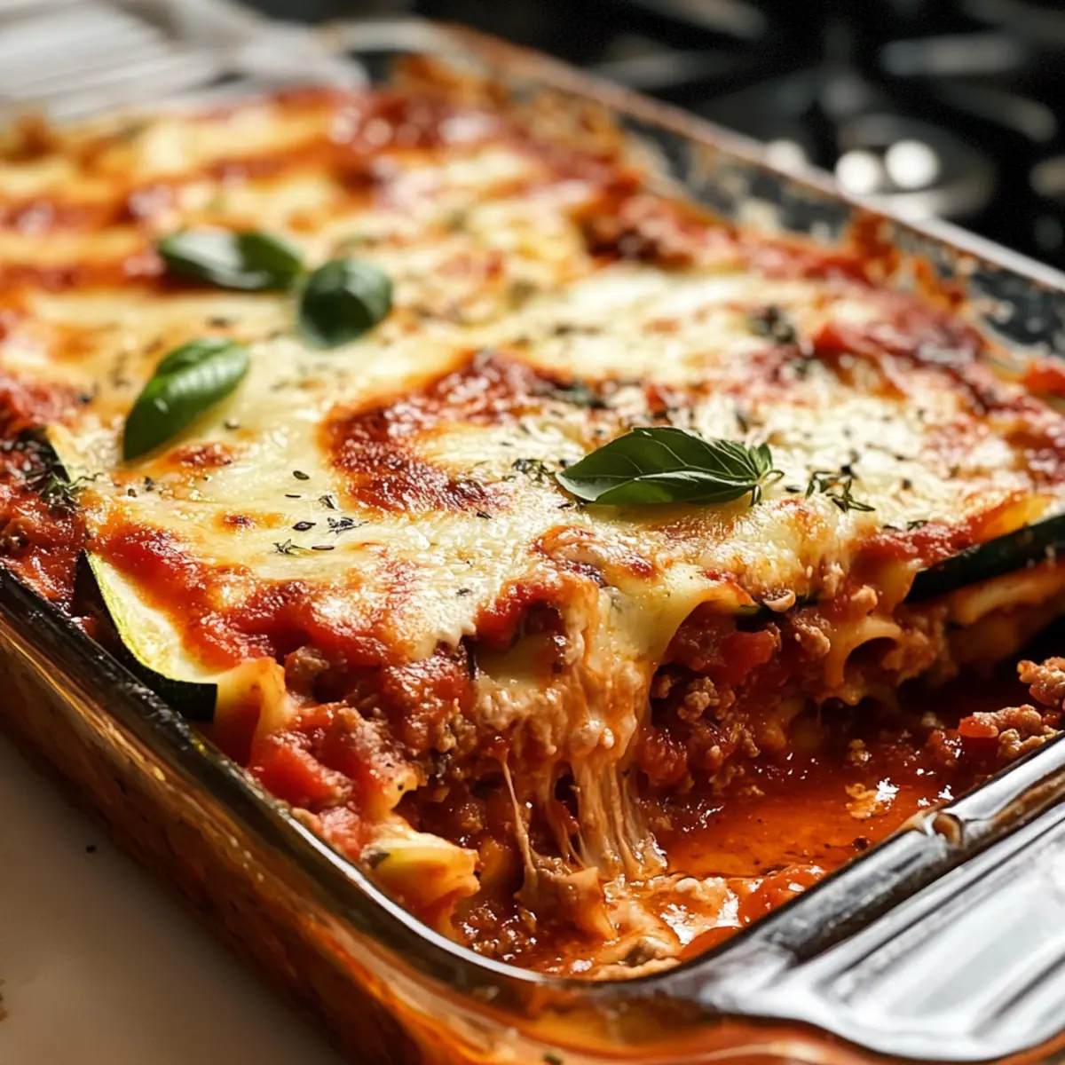 Nach dem Backen die Zucchini-Lasagne für etwa 10 Minuten ruhen lassen. Dies ermöglicht es den Schichten, sich zu setzen und sorgt für einfaches Schneiden. Vor dem Servieren nach Belieben mit frischen Basilikumblättern garnieren, um einen frischen Akzent zu setzen. Diese Zucchini-Lasagne wird sicher ein Hit bei deiner Familie werden!